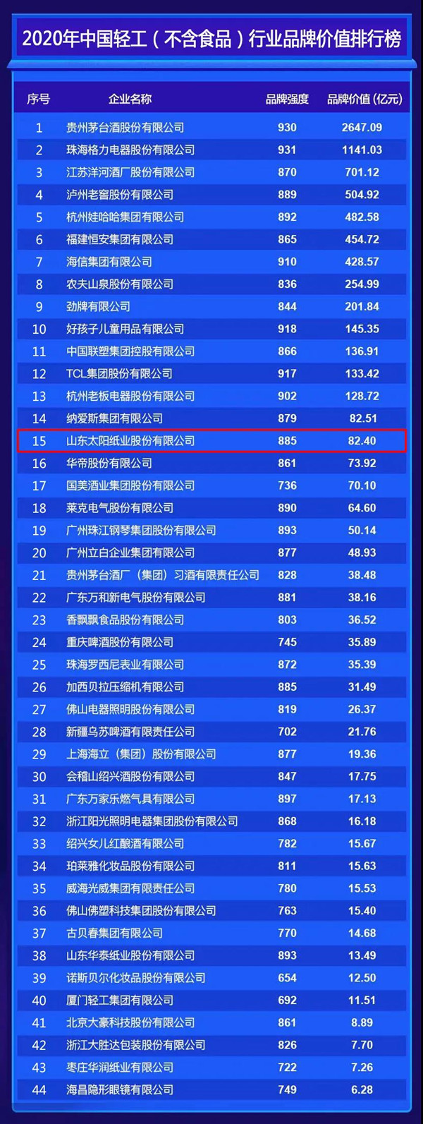 近日,中國品牌建設(shè)促進(jìn)會(huì)聯(lián)合中國資產(chǎn)評(píng)估協(xié)會(huì)等單位舉行了“2020中國品牌價(jià)值評(píng)價(jià)信息發(fā)布”線上活動(dòng),這是為踐行習(xí)近平總書記“三個(gè)轉(zhuǎn)變”重要論述、推動(dòng)形成具有中國特色的品牌價(jià)值評(píng)價(jià)機(jī)制舉行的公益性品牌價(jià)值發(fā)布活動(dòng),也是抗擊疫情,提振信心,引領(lǐng)品牌消費(fèi),打造更多享譽(yù)世界的中國品牌的重要行動(dòng)。在這次活動(dòng)中,太陽紙業(yè)以82.4億元的品牌價(jià)值位列2020年中國輕工(不含食品)行業(yè)品牌價(jià)值排行榜第十五位。