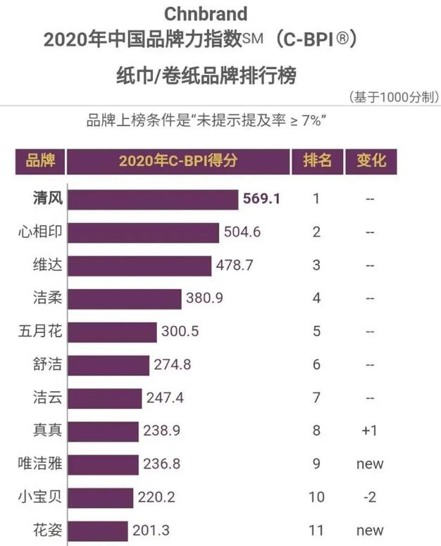 日前,品牌評級與品牌顧問機構Chnbrand發布2020年中國品牌力指數排行榜,APP(中國)旗下品牌清風憑借569.1的C-BPI得分,榮獲2020年C-BPI中國品牌榜紙巾/卷紙類第一品牌*,這已是清風第2年榮登榜首。 清風能夠連續兩年榮獲“2020年C-BPI中國品牌榜紙巾/卷紙類第一品牌*”,同公司品牌真真和唯潔雅也成功躋身前十,這不僅證明產品品質得到認可,更意味著品牌獲得廣大消費者的喜愛與支持。 Chnbrand(中企品研)是中國市場覆蓋全品類的權威品牌評級體系,自2011年起,開始發布基于消費者心智和體驗的品牌評級研究報告,迄今為止已近10年。Chnbrand推出的中國品牌力指數(C-BPI)、中國顧客推薦度指數(C-NPS)和中國顧客滿意度指數(C-CSI)先后被工業和信息化部納入品牌扶持政策體系,并享受品牌專項扶持資金。 作為專業的品牌評級機構,Chnbrand通過全方位調研消費者的認知與體驗,分析總結影響品牌價值和品牌體驗的關鍵因素,并將其作為評比標準。