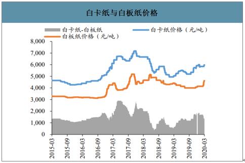 白板紙表觀消費量逐年下降,消費升級有望促進白卡紙對白板紙的替代。白板紙是一種正面呈白色且光滑,背面多為灰底的紙板,紙面較為潔白而平滑,具有較均勻的吸墨性,表面脫粉與掉毛現象較少,紙質較強韌而具有較好的耐折度,但其含水量較高,一般在10%左右,存在一定的伸縮性,這給印刷會帶來一定的影響。白板紙主要用于單面彩色印刷后制成食品、藥品、日用化學品等包裝紙盒供包裝使用,亦或者用于設計、手工制品。2018年白板紙中90%用于制作紙盒,10%用于制作襯紙。2019年白板紙表觀消費量為8095千噸,較2018年略有提升,但總體來看自2013年起白板紙表觀消費量整體呈下降趨勢,需求端不斷收縮。白板紙在包裝領域與白卡紙存在重合,但由于白板紙含水量較高,在一定程度上影響印刷質量,且存在少量脫粉掉毛情況,在使用感上不及挺度、耐破度和平滑度更高的白卡紙,伴隨消費升級,食品、藥品及日用化學品包裝等領域白板紙將被白卡紙近一步替代。 白卡紙與白板紙價格