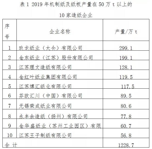 2019年,面對宏觀經濟增速放緩、中美貿易爭端加劇、環保持續趨嚴和原料供給端擴張與需求端收縮等多重壓力,江蘇省造紙工業經營發展也面臨著巨大壓力,但在逆境中江蘇省紙及紙板總產量增幅顯著。 1、2019年生產運營情況 1.1主要生產經濟指標完成情況 1.1.1 機制紙及紙板總產量 據江蘇省造紙行業協會調查統計,2019年江蘇省造紙工業累計生產機制紙及紙板總產量達到1473萬t,比2018年的1321萬t增加11.5%。 1.1.2 主要紙種產量 (1)文化用紙 2019年江蘇省文化用紙總產量為408.1萬t,占江蘇省機制紙及紙板總產量的27.7%,比2018年的381.4萬t增加7.0%。 其中:銅版紙產量244.8萬t,比2018年的239.7萬t增加2.1%;雙膠紙和復印紙原紙產量163.3萬t,比2018年的141.7萬t增加15.2%。 (2)包裝用紙及紙板 2019年江蘇省包裝用紙及紙板總產量為899.4萬t,占江蘇省機制紙及紙板總產量的61.1%,比2018年的768.6萬t增加17.0%。 其中:瓦楞原紙產量295.8萬t,比2018年的255.8萬t增加15.6%;箱紙板產量405.9萬t,比2018年的371.0萬t增加9.4%;涂布白紙板產量78.7萬t,比2018年的60.8萬t增加29.4%;紙管原紙產量0.9萬t,較2018年的6.4萬t減少86.0%;涂布白卡紙產量117.5萬t,比2018年的76.4萬t增加53.8%。 (3)生活用紙 2019年江蘇省生活用紙總產量為149.2萬t,占江蘇省機制紙及紙板總產量的10.1%,比2018年的145.0萬t增加2.9%。 。4)特種紙及紙板 2019年江蘇省特種紙及紙板總產量為16.3萬t,包括無碳復寫紙、防偽票證紙、熱敏紙、紙杯原紙、三濾紙、蚊香片紙、箱包紙板、鞋底紙板等,占江蘇省機制紙及紙板總產量的1.1%,比2018年的26.0萬t減少37.3%。 1.1.3 纖維原料結構 2019年江蘇省紙漿總消耗量1156萬t,比2018年的1057萬t增加9.4%。江蘇省木漿、廢紙漿、非木漿占比分別為38.2%、61.0%、0.8%。 其中:木漿消耗量442萬t,比2018年的422萬t增加4.7%;占紙漿總消耗量的38.2%,比2018年的39.9%減少了1.7個百分點。 廢紙漿消耗量705萬t,比2018年的630萬t增加11.9%;占紙漿總消耗量的61.0%,比2018年的59.6%增加了1.4個百分點,折合耗用廢紙881萬t。 非木漿消耗量9萬t,比2018年的5萬t增加80%;占紙漿總消耗量的0.8%,比2018年的0.5%增加了0.3個百分點。 1.1.4 實現產值、銷售收入、稅金及利潤 據江蘇省造紙行業協會統計,2019年江蘇省造紙工業總計完成工業總產值684億元,比2018年的690億元降低0.9%;實現銷售收入687億元,比2018年的693億元降低0.9%;上繳稅金25億元,比2018年的27億元降低7.4%;實現利潤62.5億元,比2018年的58.0億元增長7.8%;江蘇省虧損制漿造紙企業共5家。 1.2 區域產量分布情況 2019年,蘇南地區造紙總產量合計1070萬t,占江蘇省造紙總產量的72.6%,比上年同期的1002萬t增加6.8%;蘇中地區造紙總產量合計133萬t,占江蘇省造紙總產量的9.0%,比上年同期的112萬t增加18.8%;蘇北地區造紙總產量合計270萬t,占江蘇省造紙總產量的18.4%,比上年同期的207萬t增加了30.4%。主要原因是近年來蘇北地區一些新建生產包裝用紙的造紙企業產能釋放,未來還會有新的產能落戶蘇北(APP如東項目及江蘇鹽城鳳程紙業年產55萬t瓦楞原紙等項目),對江蘇造紙產能的均勻分布起到一定的影響。 1.3 內、外(合)資企業產量比重 2019年江蘇省內資造紙企業產量合計373.1萬t,占江蘇省機制紙及紙板總產量的25.3%,比2018年的21.9%增加了3.4個百分點,產量比2018年的289.0萬t增加29.1%,內資企業產量大幅提高的原因在于江蘇鹽城、連云港、宿遷一帶新興的造紙產能逐步釋放,導致內資企業比重加大;江蘇省外(合)資企業產量合計1099.9萬t,占江蘇省機制紙及紙板總產量的74.7%,比2018年的78.1%減少了3.4個百分點,產量比2018年的1062.0萬t增加3.6%,這是部分大型造紙企業產量提升產能波動引起的。 1.4 大中型造紙企業的市場份額繼續擴大 國家環保政策對落后產能的淘汰力度逐步加大,小型造紙企業在多方面都處于劣勢,盈利困難,2019年至今減產、停產現象較為普遍。10萬t以上的大中型造紙企業2019年合計產量達到1397萬t,占江蘇省造紙總產量的94.8%,比2018年的1262萬t增加10.7%。其中,年產量50萬t以上的大型造紙企業2019年合計產量達到1172萬t,占江蘇省造紙總產量的79.6%,比2018年1062萬t增加10.3%;2019年江蘇省大中型造紙企業的平均規模達到69.9萬t,與2018年的70萬t基本持平。 1.5 規模企業概況 2019年機制紙及紙板產量達到10萬t的造紙企業共20家,產量在50萬t以上的企業有10家(見表1)。