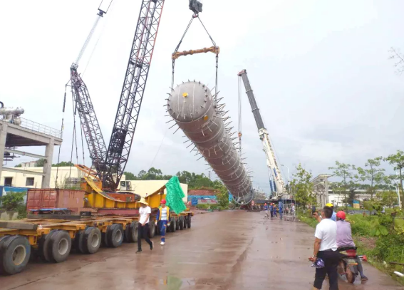 本次運(yùn)輸?shù)碾p氧水反應(yīng)器為超大型設(shè)備,長48.5米,直徑6.9米,重量達(dá)215噸。由于構(gòu)件體積大,設(shè)備從欽州港碼頭運(yùn)抵金桂施工現(xiàn)場需要通過鐵路匝口,排除海關(guān)圍網(wǎng)及監(jiān)控設(shè)施、高壓電線、通信線路等若干路障,困難重重。