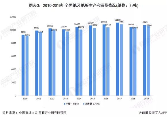 根據中國造紙協會的數據顯示,2019年我國紙及紙板生產企業約2700家,全國紙及紙板生產量為10765萬噸,較2018年增長3.16%。消費量為10704萬噸,較2018年增長2.54%。產銷基本處于平衡狀態。