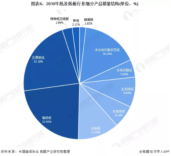從銷量結構來看,2019年我國箱紙板銷量為2403萬噸,較2018年同比增長2.47%,占紙及紙板行業總銷量的22.45%;瓦楞原紙銷量2374萬噸,較2018年增長7.28%,占紙及紙板行業總銷量的22.18%;未涂布印刷書寫紙銷量為1749萬噸,較2018年下降0.11%,占紙及紙板行業總銷量的16.34%。