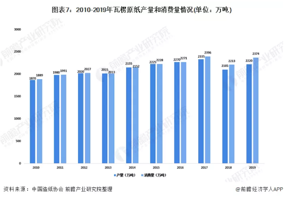 2019年我國瓦楞原紙生產量為2220萬噸,較2018年增長5.46%;消費量為2374萬噸,較2018年增長7.28%。