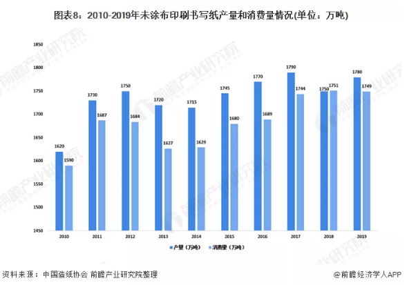 2019年我國未涂布印刷書寫紙生產量為1780萬噸,較2018年增長1.71%;消費量為1749萬噸,較2018年下降0.11%。