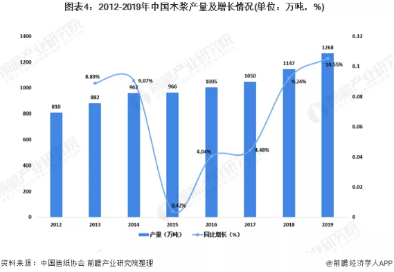 木漿產(chǎn)量逐年提升 隨著我國對紙制品要求逐漸提高,木漿造紙由于其纖維短且粗,強(qiáng)度和韌性較好等優(yōu)點(diǎn),木漿生產(chǎn)量逐漸增加,木漿在紙漿原料中的比重也逐漸增大2019年,我國木漿生產(chǎn)量達(dá)到1268萬噸。