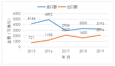圖1,2015-2019年我國內地柔印機裝機量情況 根據中國印刷及設備器材工業協會從海關總署數據的統計,2015年柔性印刷版材的進口金額為4144萬美元,出口創匯721萬美元;2016年柔性印刷版材的進口金額為4,892萬美元,同比增長18.05%;出口創匯1,198萬美元,同比增長66.16%;2017年柔性印刷版材的進口金額為2904萬美元,同比下降40.64%;出口創匯2097萬美元,同比增長75.04%;2018年柔性印刷版進口0.33億美元,同比增長12.5%,柔性印刷版出口0.16億美元,同比下降26.0%;2019年柔性版印刷版進口金額為3193萬美元,同比減少0.02%,出口創匯2096萬美元,同比增長50%。2019年柔性版材進口數量持平,出口數量大增,主要原因除了生態環境部的【2019】53號文件帶動中國柔印業務的迅速發展外,國產柔性版材質量得到市場認可,產能得到快速發展,加快了柔印制版成本整體下降(見圖2)。