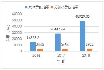 圖2,2015-2019年我國柔性印刷版材進出口情況 柔性版印刷油墨主要是水性油墨、溶劑型油墨及UV油墨。根據中國日用化工協會油墨分會發布的全國油墨行業重點企業主要經濟指標統計表數據顯示,2016年我國油墨行業重點企業的總產量為40.6萬噸,其中柔版油墨4.95萬噸,占比12.2%,水性柔版油墨產量14875.3噸,溶劑型柔版油墨產量3440噸;2017年總產量約為74.2萬噸,其中柔版油墨占7.4萬噸,占比10%,水性柔版油墨產量28447.64噸,溶劑型柔版油墨產量3484噸;2018年總產量為75.50萬噸,其中柔版油墨7.6萬噸,占比10.06%,水性柔版油墨產量48929.35噸,溶劑型柔版油墨產量3982噸。盡管數據沒有把眾多的中小油墨生產企業產量涵蓋其中,但基本可以反映出水性柔版油墨與溶劑型柔版油墨隨著柔印產業在國內的不斷發展,銷量正在加快增長。特別是2018年統計數據中,柔版油墨生產企業中80%的企業均生產水性柔版油墨,27%的企業生產UV油墨與水性光油,相對較少,可見少(無)VOCs排放的水性柔版油墨增長勢頭明顯,顯示出綠色柔印工藝在我國印刷行業的應用在增長的態勢(見圖3)。