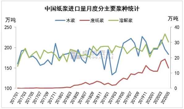 圖1 2016-2019年中國紙漿進口量持續增長,年均增長率在8.26%;木漿進口量的年均增長率在7.23%,而其他紙漿進口量的年均增長率達到15.65%,尤其是2018-2019年增速明顯,2019年其他紙漿進口量環比增加25.64%。 其他紙漿中包含廢紙漿、溶解漿,從圖中可以發現,從2018年開始,廢紙漿的進口量持續增長,這是由于自2018年開始廢紙進口政策密集出臺,2018年3月1日開始,廢紙進口新規實施,對進口企業資質和進口廢紙含雜率做出明確規定,進口廢紙企業規模要求在5萬噸/年以上,進口廢紙含雜率≤0.5%。2018年6月國務院發布《中共中央國務院關于全面加強生態環境保護堅決打好污染防治攻堅戰的意見》,明確提出全面禁止洋垃圾入境,力爭2020年底前基本實現固廢零進口。 據海關數據顯示,2018年廢紙漿進口量29萬噸,同比增加2371%;2019年進口廢紙漿量91萬噸,同比增加209%;2020年前5個月進口量73萬噸,較2019年前5個月廢紙漿進口量同比增加280%,已經占到2019年總進口量80%,前5個月廢紙漿的進口量占紙漿進口總量的6%,較去年同期占比增加4.09個百分點。預計2020年廢紙漿進口量持續增加,有望增加至200萬噸。 粘短開工低位,溶解漿進口量占比窄幅下滑 溶解漿進口量方面,2020年以來呈現持續攀升態勢,主要受進口溶解漿價格低位影響,以闊葉溶解漿615美元/噸外盤計算,主港成本不足5000元/噸,國產闊葉溶解漿含稅到廠價在5300元/噸,遠不敵進口溶解漿成本優勢明顯,且國產溶解漿廠家木片依賴進口,人民幣匯率貶值加劇成本壓力,國產漿價已在漿廠盈虧線附近徘徊,故導致進口溶解漿量持續增加,2020年前5個月共進口溶解漿148萬噸,同比增加12%,占紙漿進口量的12%,但較去年同期占比下滑0.93個百分點。 溶解漿與廢紙漿不同,下游粘膠短纖含稅承兌價8900元/噸,以價難換量,6月18日粘膠短纖行業周度開工率在66%附近徘徊,7月傳統紡織產業需求淡季擔憂情緒,粘短業內價格走勢或仍較為被動,預計溶解漿進口量或難有效支撐。長期來看,今明兩年粘膠短纖國內新增產能35萬噸,溶解漿市場需求端無明顯增量支撐,供需失衡現象暫難緩解。預計溶解漿進口量維持相對平穩態勢,但在紙漿進口量占比中或因廢紙漿進口量增加而出現占比小幅下滑可能。 廢紙漿進口量急速增加,木漿進口量占比窄幅下滑 木漿進口量方面,我們可以看到,在國內需求較為穩定,尤其是禁塑令影響下及其他主要國家發貨比較穩定的影響下,前5個月木漿進口量990萬噸,較去年同期增加15%,占2019年總進口量的43%。前5個月木漿進口量占紙漿進口量的81%,較去年同期的占比下滑3.26個百分點,主要受廢紙進口量占比增加影響。 整體來看,廢紙漿的進口量占比在紙漿進口量中增加明顯,木漿進口量、溶解漿進口量占比下滑。 卓創分析,廢紙政策導致廢紙供應緊張,預計廢紙漿進口量持續增加,在紙漿進口量占比有明顯提升;在禁塑令影響下,白卡紙替代白板紙的作用下,化機漿用量增加,而未來國內行業新增產能多為漿紙一體化產能,進口木漿的對外依存度預計在未來5年有降低可能;溶解漿受全球供需兩弱因素影響,進口量增速有放緩可能,但受后期新增產能因素影響,進口量占比相對穩定。 2020年來看,木漿進口量依舊維持增長態勢,且從主要國家出口情況來看,巴西6月份前3周總出口量按照出口到中國的比例計算接近50萬噸,處于正常范圍之內,而前5個月智利、巴西出口到中國的量較去年同期呈穩中增加態勢,預計闊葉漿進口量后期或較為穩定;針葉漿方面,2020年前4個月,主要國家出口到中國的針葉漿量較去年同期累計下降8.28萬噸,其中智利、加拿大下滑較為明顯,從目前數據來看,6月份針葉漿進口量供應較為穩定,但7月份針葉漿進口量有下滑可能。