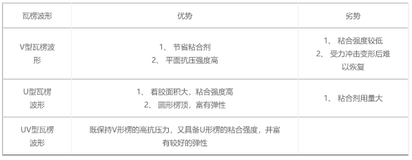 表1不同類型瓦楞原紙的環(huán)壓指數(shù) 2、原紙的緊度 緊度,是指每立方厘米的原紙的重量,是衡量原紙組織結(jié)構(gòu)緊密程度的指標(biāo),決定著原紙的剛性、強(qiáng)度、透氣性和吸收性等特性。當(dāng)多種原紙利用粘合劑粘合后,緊度高的原紙由于自身纖維具有較強(qiáng)的互相牽拉力,從而與粘合劑的結(jié)合效果好,整體的粘合強(qiáng)度高。反之,粘合劑則容易被原紙吸收分散,相同的施膠劑量,單位面積的膠量減少,降低了原紙間的粘合強(qiáng)度,間接影響了成品瓦楞紙箱的抗壓強(qiáng)度。 3、原紙的水分與施膠度 瓦楞紙箱所用的原紙一般由植物性纖維構(gòu)成,經(jīng)過一系列加工,會(huì)含有一定量的水分,正常應(yīng)控制在9%~12%,利于瓦楞成型。若原紙含水量低于9%時(shí),施膠后原紙會(huì)吸濕而產(chǎn)生氣泡,減少了瓦楞與面紙/里紙的粘結(jié)面積。若原紙含水量過高,則施膠易擴(kuò)散,降低了粘合強(qiáng)度。 于此同時(shí),施膠度也會(huì)對(duì)原紙的水分含量產(chǎn)生一定的影響。通常,在原紙生產(chǎn)中,施加一定量的耐水性的膠體物以提高原紙抗水性的工藝為施膠。這一工藝要求施膠度合理,才能使原紙不易吸濕,保持其含水量的穩(wěn)定,進(jìn)而保障成品紙箱的抗壓強(qiáng)度。但是,若施膠度過高,即水分含量較低,原紙纖維會(huì)變的松脆,影響成箱后的抗壓強(qiáng)度。若原紙的施膠度過低,則無法阻隔吸收外界的潮氣,造成原紙的含水量增高,纖維膨脹,環(huán)壓強(qiáng)度大幅降低。 二、瓦楞紙箱的成型工藝影響 1、瓦楞紙箱的棱形、波形 瓦楞紙箱的楞形一般分為A、B、C、E、K五種,其中前四種應(yīng)用最為廣泛。A型楞是最先發(fā)明的一種瓦楞形狀,具有最大的瓦楞間距和高度,單位長(zhǎng)度內(nèi)瓦楞數(shù)量最少,這種形狀富有一定的彈性,能發(fā)揮良好的緩沖性能,承載較大的沖擊力;B型楞與A型楞截然相反,瓦楞高度最低,單位長(zhǎng)度瓦楞密度大,紙板表面平整,具有較高的平壓強(qiáng)度,在外界壓力下不易變形,穩(wěn)定性好。C型楞的楞高和單位長(zhǎng)度內(nèi)的瓦楞數(shù)均介于A型與B型之間,性能也介于二者之間。E型楞的瓦楞楞薄而密,其剛性和強(qiáng)度、手感硬度較好。 綜合以上各種楞形的特點(diǎn),成箱后的抗壓強(qiáng)度從高到低依次為A、C、B、E。在實(shí)際應(yīng)用中,為了獲得更高的抗壓強(qiáng)度,通常采用兩種或三種楞形結(jié)合的方式構(gòu)成三層、五層或七層的瓦楞紙板。 除了楞形以外,構(gòu)成瓦楞紙板的波形也會(huì)對(duì)瓦楞紙板和成箱的強(qiáng)度造成影響。V形、U形和UV型是三種主要波形,分別具有不同特征,如表2。從表中可以看出,UV型是一種理想波形,生產(chǎn)者亦可以根據(jù)實(shí)際需求選擇合適的波形。