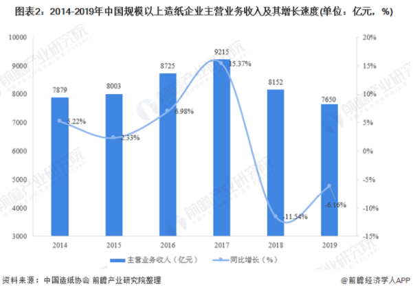 據中國造紙協會統計數據顯示,2014-2017年,我國規模以上造紙企業主營業務收入穩步提升,2018年以來,隨著我國造紙行業落后產能淘汰工作的持續深入以及原材料價格波動影響,我國規模以上造紙企業主營業務收入有所下滑,2019年,全國規模以上造紙企業主營業務收入為7650億元,同比下降6.16%。在統計的2524家造紙生產企業中,虧損企業有560家,占22.19%。