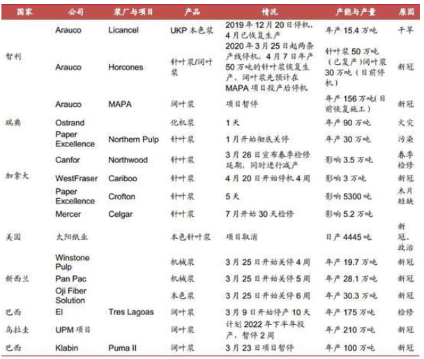 資料來源:WIND,招商期貨研究所 (二)短期供應存在問題 在紙漿沒有大規模投產的背景下,2020年新冠疫情的影響使得供應端出現了一些問題。先是智利紙漿巨頭Arauco旗下的Arauco漿廠(年產針葉漿50萬噸,闊葉漿30萬噸)在3月25日宣布因有員工感染新冠病毒而暫時停產,隨后加拿大West Fraser旗下的Cariboo(年產針葉漿35萬噸)在4月20日也因新冠疫情出現停產,實際影響產量約5萬噸。接著,Arauco與Klabin在建項目也陸續停工。 此外從2019年國內紙漿價格大幅下挫以來,市場一直在討論的加拿大漿廠成本問題逐步發酵,據海外資訊機構信息,由于木片緊張成本高企等原因,加拿大Canfor旗下Intercontinetal漿廠、Northwood漿廠以及George Prince漿廠陸續發布停產檢修通知,隨后Paper Excellence旗下Crofton漿廠(年產量34萬噸)因木片短缺停產5天;5月底美森國際旗下Celstar漿廠(年產針葉漿42萬噸)也宣布7月進行停產檢修。再考慮到年初Paper Excellence旗下的Northern Pulp因環境問題而徹底停產,加拿大漿廠的這輪檢修與停產對市場引起了一定沖擊。 不過從國內期貨價格的反應看,似乎影響力在邊際遞減。Northern Pulp是在1月爆出停產消息的漿廠,當時國內期貨價格出現了較大漲幅,但是隨著各種漿廠停產以及檢修新聞的持續爆發,國內期貨價格反應越來越小,最近的Celstar的檢修消息對盤面幾乎沒有什么影響。國內期貨價格似乎更多的關注于需求端的故事。 為什么外盤供應問題對國內影響力越來越小呢? 表1:海外疫情影響停產情況