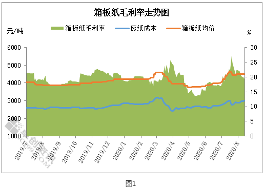 近一段時間以來,國內(nèi)箱板紙與廢舊黃板紙價格走勢呈現(xiàn)出一定的背離走勢。根據(jù)卓創(chuàng)資訊統(tǒng)計的國內(nèi)箱板紙均價與廢舊黃板紙均價看,箱板紙價格弱勢下滑,而廢舊黃板紙價格則呈上漲格局。卓創(chuàng)資訊監(jiān)測的箱板紙毛利率數(shù)據(jù)顯示,箱板紙毛利率已連續(xù)三周下行,紙企利潤空間在不斷被壓縮。 從包裝原紙的情況看,在6、7月份的漲價刺激下,國內(nèi)二級廠進行了大量的備貨。不過由于終端需求相對緩慢,二級廠目前還是以消耗庫存為主。根據(jù)部分紙企反饋的信息看,現(xiàn)在紙企的訂單量萎縮的較為嚴(yán)重。