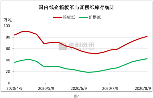 由于原紙需求減少,紙企原紙庫存也在大幅增加。根據(jù)卓創(chuàng)資訊統(tǒng)計的49家樣板紙企的箱板原紙周度庫存看,從7月2日當(dāng)周箱板原紙增加以來,截止8月13日當(dāng)周,瓦楞原紙庫存增加幅度近60%。而瓦楞紙周度庫存較6月18日當(dāng)周的年內(nèi)低點增加了128%。包裝原紙庫存大幅增加的原因一方面是,國內(nèi)紙企的開工率保持相對高位;另一方面是則是下游原紙需求減弱,紙企原紙由主動補庫存快速轉(zhuǎn)化為被動補庫存。 對于紙企而言,由于廢紙原料價格相對堅挺,而成品紙需求疲弱,價格下行,其造紙利潤也受到了很大的擠壓。持續(xù)攀升的原紙庫存,也使得紙企的資金鏈?zhǔn)艿捷^大沖擊。如果需求依然沒有好的改善,那么紙企可能進入主動去成品紙庫存階段。在這個過程中,紙企的包裝原紙價格競爭壓力將加大,同時也不排除紙企降低開工負(fù)荷,這將對廢紙原料也形成一定的下行壓力。