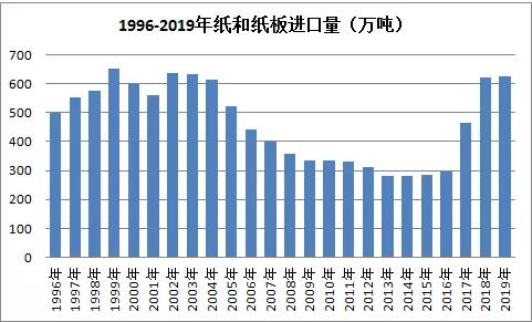 而這一年,中國紙和紙板進口數量為401萬噸,比上一年減少了40萬噸,進口紙正式走進下坡路。 也是在這一時期,以玖龍、理文、山鷹等為代表的造紙廠開始形成崛起之勢,在設備、技術及產量上對進口紙形成了全面的趕超。受益于國內相對低廉的人工成本和源源不斷的優質進口廢紙,國產紙以碾壓之勢,讓中低端進口紙徹底走向沒落,僅在部分高端市場保留一點份額。 4.重來:進口紙數量3年重回巔峰 需要注意的是,進口紙的沒落并不是突然形成,而是在和國產紙長期的供需平衡、質量、交期以及售后服務等多方面博弈、敗落后,其數量才慢慢降下來的。從2002年達到636.94萬噸的巔峰,到2016年不足300萬噸,中國紙企用了十幾年時間的努力完成了對進口紙的超越。 然而,中國優質林木資源不足的短板,卻一直是中國造紙行業心腹大患。此外,對青山綠水的環保追求帶來的管控,也讓大批中小落后紙廠被淘汰,造紙行業集中度不斷提高。 管控還來自于對廢紙進口的約束,2016年我國進口廢紙2849萬噸,2017年外廢進口限令發布后進口量為2572萬噸,隨后進口量逐年縮水,帶動造紙原料成本不斷攀升。進口紙的機會來了! 2017年是我國施行外廢進口限令的第一年,在業內引起了極大地恐慌,“紙荒”“一紙難求”“漲價潮”等字眼貫穿了2017年下半年,2017年10月中旬國家統計局公布的流通領域重要生產資料市場價格變動情況顯示,高強瓦楞紙價格在當月達到了5730元/噸,創下瓦楞紙價格歷史之最。 這一年,我國紙和紙板進口數量466萬噸,而2016年為297萬噸。進口紙正式卷土重來,進口量重新攀升。2018年,年紙及紙板進口622萬噸,較上年增長33.48%;2019年紙及紙板進口625萬噸。 而進入到2020年,在原紙價格劇烈波動、國外原紙需求持續低迷的情況下,進口紙大量涌入,進一步推進部分地區進口紙的重來之勢!這種“一夜回到三十年前”,無疑給全體造紙包裝企業提了個醒。
