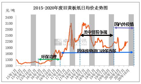 由上圖見,2015年四季度廢黃板紙均價(jià)呈現(xiàn)平穩(wěn)運(yùn)行,四季度內(nèi)價(jià)格波動(dòng)幅度小于100元/噸,當(dāng)時(shí)的宏觀背景是供給側(cè)改革,包裝原紙市場(chǎng)暫時(shí)處于供過于求狀態(tài),但廢紙供應(yīng)充足。 2016年四季度廢黃板紙價(jià)格大幅沖高,主要是環(huán)保治理帶來成品紙減量預(yù)期,成品紙價(jià)格大幅快速上漲,這其中廢黃板紙價(jià)格因投機(jī)氣氛較重,市場(chǎng)廢紙流通速度放慢,此背景下紙廠樂意推高采購(gòu)價(jià)格,因廢紙價(jià)格上漲會(huì)繼續(xù)促進(jìn)成品紙價(jià)格上漲,增加成品紙銷量,這樣的循環(huán)非常良性。也正是這樣的良性循環(huán)推動(dòng)廢紙價(jià)格漲至當(dāng)年的歷史高位。 2017年四季度廢黃板紙價(jià)格先沖至歷史次高點(diǎn)其后跳水。沖至歷史次高點(diǎn)的原因是固體廢物進(jìn)口政策改革帶來進(jìn)口廢紙減少的預(yù)期,進(jìn)口廢紙是國(guó)內(nèi)重要廢紙供應(yīng)來源。在進(jìn)口廢紙減少的預(yù)期下,加之2016年投機(jī)囤貨操作的普及,2017年二、三季度廢紙市場(chǎng)囤貨操作異;鸨。而囤貨操作的精髓是不單要提前入場(chǎng),還是及時(shí)獲利套現(xiàn)。那么2017年國(guó)慶節(jié)后,在一些市場(chǎng)小道利空消息的簇?fù)硐,市?chǎng)囤積的廢紙蜂擁而出,廢紙價(jià)格狂瀉長(zhǎng)達(dá)9天,多數(shù)紙廠廢黃板紙采購(gòu)價(jià)格腰斬。在2017年四季度剩余的時(shí)間內(nèi),廢黃板紙價(jià)格曾經(jīng)大幅急速反彈,但恐懼的心態(tài)持續(xù)籠罩,2017年11月廢黃板紙價(jià)格也出現(xiàn)二次探底。 2018年四季度廢黃板紙價(jià)格持續(xù)下跌,固體廢物進(jìn)口管理制度改革的影響已經(jīng)大部分兌現(xiàn)為價(jià)格漲幅,而由美國(guó)挑起的中美貿(mào)易爭(zhēng)端帶來的紙包裝需求現(xiàn)況持續(xù)壓制成品紙與廢紙價(jià)格走勢(shì)。 2019年四季度,廢黃板紙價(jià)格呈現(xiàn)上升走勢(shì),固廢進(jìn)口政策改革與中美貿(mào)易爭(zhēng)端形成價(jià)格的上下?lián)醢澹?019年四季度的剛性需求支撐了成品紙與廢黃板紙價(jià)格的上升。 2020年四季度,廢黃板紙面臨國(guó)內(nèi)外疫情帶來的需求減少預(yù)期,此外固廢進(jìn)口政策的底部支撐效果仍在,由此預(yù)期2020年四季度廢黃板紙價(jià)格以震蕩上揚(yáng)為主。此外,仍有不確定性因素需要關(guān)注,例如:美國(guó)大選、東南亞對(duì)進(jìn)口廢紙的態(tài)度、禁塑令等。