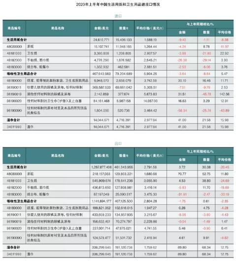 根據海關統計數據, 2020年上半年中國生活用紙和衛生用品進出口情況分析如下: 生活用紙 進口 2020年上半年, 生活用紙總進口量約1.55萬t, 相較于2019年同期減少1.11%;總進口額2,461萬美元, 比2019年同期 (2,716萬美元) 減少9.4%;平均進口價格為1,588.19美元/t,比2019年同期(1,733.36美元/t)下降8.38%。進口以原紙為主, 占生活用紙總進口量的77.1%, 進口量較2019年同期增加8.78%, 為1.19萬t。成品生活用紙進口價格都有不同程度的上漲, 其中衛生紙的平均進口價格比2019年同期上漲22.92%。 出口 2020年上半年生活用紙總出口量大幅增長30.38%,達到46.13萬t;出口額同比增長3.72%, 出口產品的平均價格為2,791.58美元/t, 同比下降20.45%。整體呈現量增價跌的趨勢。生活用紙產品的出口量除紙臺布、 紙餐巾類小幅度下降外, 均取得了雙位數的增長, 其中原紙的出口量增長達到52.75%, 出口總金額增長70.77%, 出口單價增長11.80%。成品生活用紙出口的價格都有一定程度的下降。 衛生用品 進口 2020年上半年, 吸收性衛生用品總進口量7.92萬t, 同比減少8.64%;進口額4.68億美元, 平均價格比2019年同期提高5.47%。吸收性衛生用品的進口貿易整體呈現量減價升的趨勢。 2020年上半年嬰兒紙尿褲的進口量同比減少9.79%, 成人紙尿褲產品進口量也大幅降低45.78%, 但進口的平均價格大幅度增長142.56%。衛生巾/衛生護墊和止血塞類產品的進口量5987.16t, 同比增長了3.29%, 但增長率與2019年同期相比也明顯降低。 出口 2020年上半年吸收性衛生用品的總出口量同比微增0.61%,出口額同比減少1.75%, 平均價格比2019年同期降低2.35%。 主要產品種類出口量同比均有減少, 其中嬰兒紙尿褲出口量同比減少3.80%, 成人紙尿褲產品出口量同比減少1.49%,衛生巾/衛生護墊和止血塞類產品出口較為平穩, 出口量微減0.9%。出口產品以嬰兒紙尿褲為主, 占總出口量的33.12%。 濕巾 進口 2020年上半年, 濕巾產品的進口情況相較2019年同期增長明顯, 進口量同比增長21.58%, 平均價格同比上升15.98%, 達到2977.84美元/t。但相比出口, 濕巾進口總量較少, 只有出口量的2.5%。 出口 濕巾產品的出口量和出口額繼續保持較大幅度增長, 其中出口量同比增長68.34%, 出口額同比增長89.80%, 出口平均價格也同比上升12.75%。 2020年上半年, 受到新冠肺炎疫情影響, 中國吸收性衛生用品進出口業務出現一定程度的下滑, 特別是出口業務, 增長率與上年同期相比顯著降低。 得益于疫情期間對消毒和衛生濕巾需求的大幅上升, 濕巾的進出口業務呈現出強勁的增長勢頭。