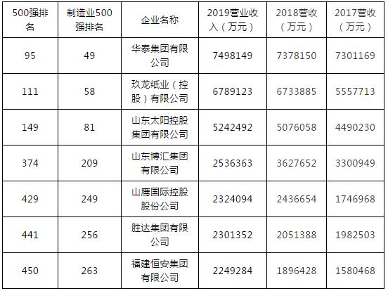 共有7家造紙企業(yè)進(jìn)入了民營企業(yè)500強(qiáng)和民營制造業(yè)企業(yè)500強(qiáng)榜單,華泰集團(tuán)有限公司以7498149萬元的營收排名總榜單第95位,造紙行業(yè)第一位。玖龍紙業(yè)、太陽控股、博匯集團(tuán)、山鷹國際、恒安集團(tuán)和勝達(dá)集團(tuán)依次列后,排名順序與2019年完全相同。