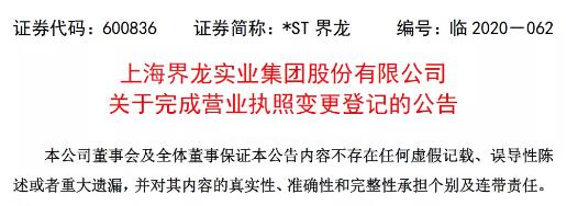 導語:9月24日,上海界龍實業集團股份有限公司發布公告稱,已取得上海市市場監督管理局換發的《營業執照》,完成了章程備案、工商變更登記及公司主要成員備案手續。界龍集團正式更名了!