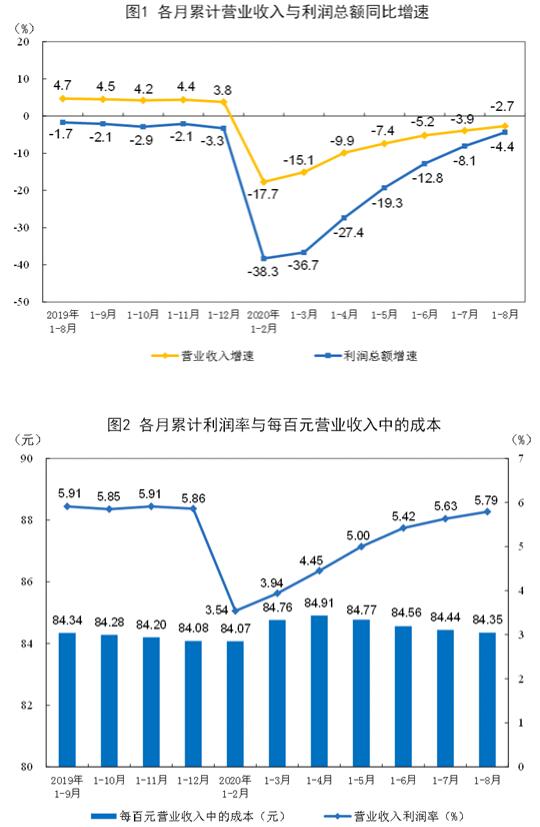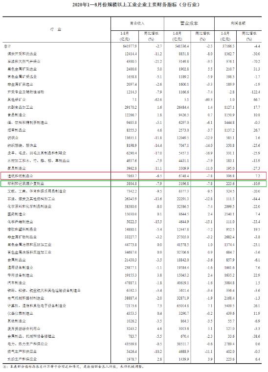 9月27日,國家統計局發布2020年1~8月份全國規模以上工業企業利潤情況。1—8月份,全國規模以上工業企業實現利潤總額37166.5億元,同比下降4.4%,降幅比1—7月份收窄3.7個百分點。 1—8月份,規模以上工業企業中,國有控股企業實現利潤總額9509.4億元,同比下降17.0%;股份制企業實現利潤總額26340.8億元,下降5.2%;外商及港澳臺商投資企業實現利潤總額10384.4億元,下降0.4%;私營企業實現利潤總額10699.7億元,下降3.3%。 值得關注的是,造紙和紙制品業實現利潤總額396.8億元,同比增長7.2%;印刷和記錄媒介復制業實現利潤總額223.6億元,同比下降10.9%。