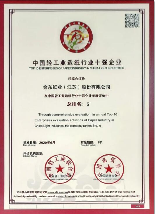 據悉,為促進造紙行業企業提高競爭力,鼓勵造紙行業現金企業做大做強,中國造紙協會依據中國輕工業聯合會制定的中國輕工業行業十強企業評審辦法和2019年度造紙工業發展情況,開展2019年度“中國輕工業百強企業”和各行業十強評價工作,本次金東紙業名列造紙行業十強企業第五位。