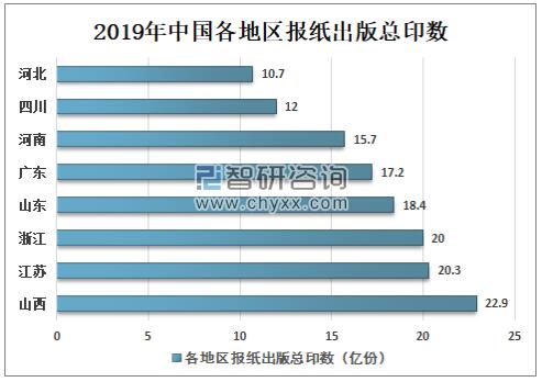 中國報紙出版總印數排名前三的地區是山西、江蘇、浙江,其中山西省報刊導向正確、把握有力、運行態勢平穩。2019年山西報紙出版總印數22.9億份,居全國第一;其次是江蘇、浙江省,報紙出版總印數分別是20.3億份、20億份。