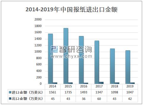 智研咨詢發布的《2020-2026年中國報紙行業市場運營模式及發展前景展望報告》數據顯示:2014-2019年中國報紙進出口貿易市場呈貿易逆差態勢,2018年中國報紙進口金額為1098萬美元,出口金額43萬美元;2019年中國報紙進口金額為1047萬美元,出口金額42萬美元,