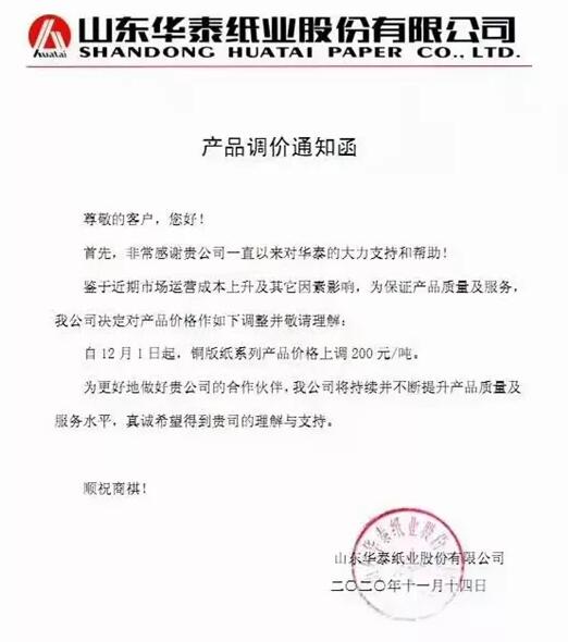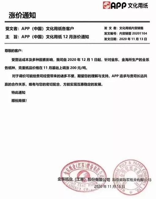 雙11剛過完不久,紙市立馬迎來APP、太陽(yáng)、晨鳴、華泰等紙企漲價(jià)函,文化紙均宣布在12月1日漲價(jià)200元/噸。 1、APP集團(tuán)(金東、金海紙廠) 受運(yùn)營(yíng)成本及多種因素影響,我司自2020年12月1日起,針對(duì)金東,金海所生產(chǎn)的全系各紙種、克重紙品價(jià)格在11月基礎(chǔ)上調(diào)漲200元/噸。