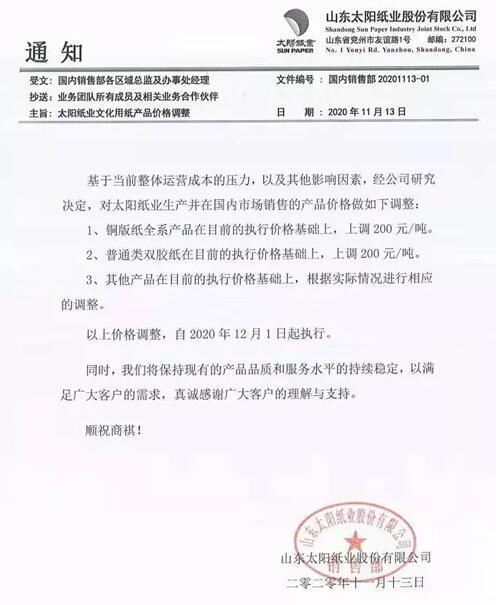 2、太陽(yáng)紙業(yè) 基于當(dāng)前整體運(yùn)營(yíng)成本的壓力,以及其它影響因素,經(jīng)公司研究決定,對(duì)太陽(yáng)紙業(yè)生產(chǎn)并在國(guó)內(nèi)市場(chǎng)銷售的產(chǎn)品價(jià)格做如下調(diào)整: 1、銅版紙全系產(chǎn)品在目前的執(zhí)行價(jià)格基礎(chǔ)上,上調(diào)200元/噸。 2、普通類雙膠紙?jiān)谀壳暗膱?zhí)行價(jià)格基礎(chǔ)上,上調(diào)200元/噸。 3、其它產(chǎn)品在目前的執(zhí)行價(jià)格基礎(chǔ)上,根據(jù)實(shí)際情況進(jìn)行相應(yīng)的調(diào)整。 以上價(jià)格調(diào)整,自2020年12月1日起執(zhí)行。