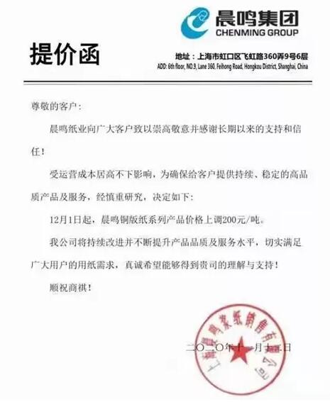 3、上海晨鳴紙業(yè) 受運(yùn)營(yíng)成本居高不下影響,為確保給客戶提供持續(xù)、穩(wěn)定的高品質(zhì)產(chǎn)品及服務(wù),經(jīng)慎重研究,決定如下: 12月1日起,晨鳴銅版紙系列產(chǎn)品價(jià)格上調(diào)200元/噸。