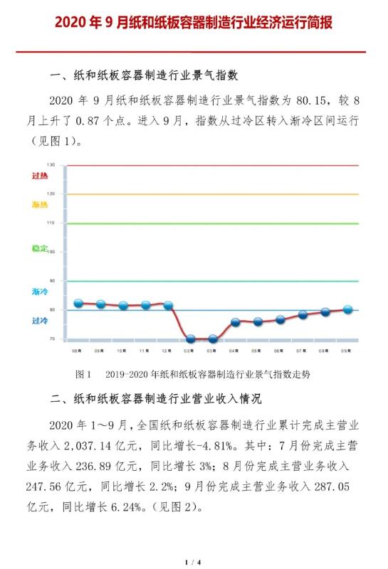 11月16日,中國包裝聯合會公布了2020年9月紙和紙板容器行業經濟運行簡報。數據顯示,9月份,紙和紙板容器制造行業景氣指數為80.15,較8月份上升了0.87個點。同時,指數從過冷區轉入漸冷區運行,景氣度持續向好。
