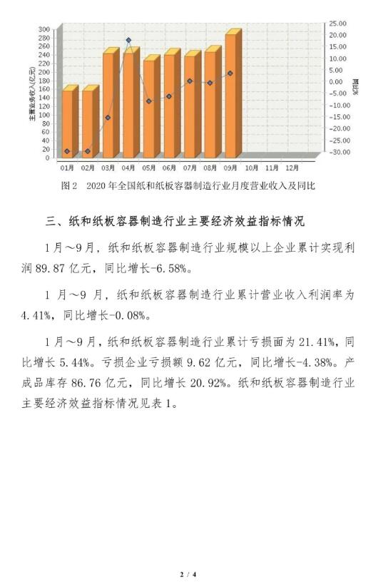 在經營數據方面,1-9月份,全國紙和紙板容器制造行業累計完成營收2037.14億元,同比下滑4.81%;紙和紙板容器制造行業規模以上企業累計實現利潤89.87億元,同比下滑6.58%。
