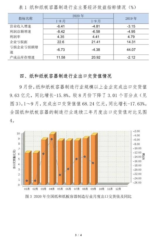 1-9月份,紙和紙板容器制造行業累計虧損面為21.41%,同比增長5.44%。虧損企業虧損額9.62億元,同比下滑4.38%。產成品庫存86.76億元,同比增長20.92%。