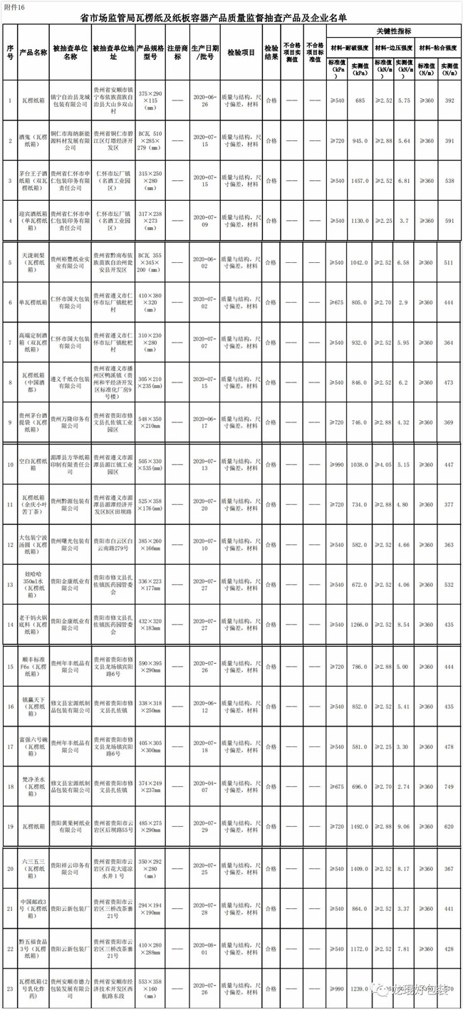 其中,在瓦楞紙箱方面,貴州省市場監管局對17家企業生產的23批次瓦楞紙及紙板容器產品質量開展了監督抽查,涉及貴陽市、遵義市、安順市、銅仁市、黔南州等5個市(州)。