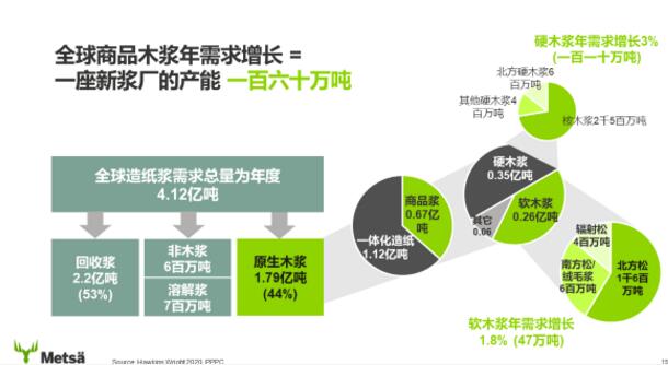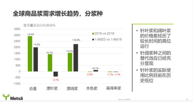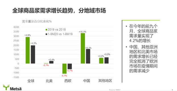 小知識(shí):我們把全球的紙漿分成幾個(gè)大類(lèi),廢紙漿(回收纖維漿),非木漿和溶解漿,原生木漿。原生木漿中一部分來(lái)自一體化的漿廠,另一部分是所謂的商品漿,商品漿全球需求量在每年6700萬(wàn)噸左右。商品漿又分為針葉漿和闊葉漿。對(duì)于芬林芬寶來(lái)說(shuō),我們主要的細(xì)分市場(chǎng)在北方松木,全球每年需求量約為1600萬(wàn)噸。兩種漿市場(chǎng)需求增長(zhǎng)方面,針葉漿每年不到2%,約47萬(wàn)噸左右,闊葉漿為每年3%。按照總量來(lái)算,全年對(duì)商品漿的需求增長(zhǎng)量為160萬(wàn)噸左右,大概是一個(gè)新漿廠的規(guī)模。 我們?cè)倏聪虏煌埛N對(duì)漿的需求占比。在2010-2019年的十年間,不同紙種對(duì)漂針漿占商品漿總量的比例變化,生活用紙從37%上升至42%,很明顯成為最大的漂針漿需求來(lái)源。印刷書(shū)寫(xiě)紙從37%降至27%,尤其在歐美等相對(duì)發(fā)達(dá)市場(chǎng)已經(jīng)成為趨勢(shì)。特種紙的變化不大,包裝類(lèi)紙板的需求從6%上升到12%。 未來(lái)10年這個(gè)變化趨勢(shì)在未來(lái)還會(huì)延續(xù):包裝紙板將實(shí)現(xiàn)增長(zhǎng),印刷書(shū)寫(xiě)紙還會(huì)有進(jìn)一步縮減,特種紙還會(huì)有略微增長(zhǎng),最大的生活用紙對(duì)針葉漿需求占比還會(huì)進(jìn)一步提升,在2027年將達(dá)到接近一半的占比。 商品漿生產(chǎn)產(chǎn)能的變化方面,漂針漿在今后3-4年間沒(méi)有新的大型項(xiàng)目出現(xiàn)。加上部分轉(zhuǎn)產(chǎn)的影響,用作造紙的漂針漿將從2200萬(wàn)噸降至2100萬(wàn)噸左右。 匯率對(duì)成本的影響 成本方面,匯率對(duì)漂針漿成本的影響,主要取決于主要紙漿供應(yīng)國(guó)的貨幣和美元兌換匯率的變化情況,因?yàn)榘W洲市場(chǎng)在內(nèi)的全球商品漿市場(chǎng)全部是以美元計(jì)價(jià)。在一年不到的時(shí)間內(nèi),美元對(duì)人民幣貶值9%,從國(guó)內(nèi)使用者的角度來(lái)看,人民幣升值會(huì)降低采購(gòu)成本。 作為紙漿供應(yīng)國(guó),歐元對(duì)美元的匯率上升了8%,如果成本以歐元計(jì)價(jià),銷(xiāo)售價(jià)格以美元計(jì)價(jià),歐元走強(qiáng)對(duì)歐洲供應(yīng)商是很大的挑戰(zhàn),而且目前沒(méi)有明顯的緩解跡象。其他國(guó)家如巴西雷亞爾對(duì)美元,一年內(nèi)貶值了33%,對(duì)中國(guó)市場(chǎng)的競(jìng)爭(zhēng)力大幅提升。盧布也是如此,一年內(nèi)對(duì)美元貶值了20%,因此俄羅斯漂針漿目前競(jìng)爭(zhēng)力最強(qiáng),其中匯率起到了最大的作用。加拿大作為另一個(gè)中國(guó)市場(chǎng)的主要供應(yīng)國(guó),加元從今年二季度到目前對(duì)美元逐漸走強(qiáng),對(duì)加拿大供應(yīng)商本身是一個(gè)不利因素。大家通常關(guān)注人民幣對(duì)美元的匯率,如果觀察紙漿供應(yīng)國(guó)匯率的變化情況,就會(huì)有更全面的理解。 小結(jié) 簡(jiǎn)單小結(jié)一下,雖然今年全球經(jīng)濟(jì)受疫情影響很大,但是我們認(rèn)為造紙行業(yè)的長(zhǎng)期趨勢(shì)不變,即商品漿的需求量增長(zhǎng)受到市場(chǎng)發(fā)展的長(zhǎng)期支持。生活用紙、包裝用紙、特種紙將長(zhǎng)期向好,是商品漿市場(chǎng)需求增長(zhǎng)的主要?jiǎng)恿ΑV袊?guó)造紙行業(yè)不可能獨(dú)善其身,并且對(duì)木片和造紙漿的依賴(lài)程度逐漸提高,因此產(chǎn)業(yè)鏈安全對(duì)于行業(yè)來(lái)說(shuō)是全球性的問(wèn)題,短期如何應(yīng)對(duì)疫情,確保工廠生產(chǎn)和供應(yīng)鏈平穩(wěn)順暢是最關(guān)鍵的,尤其對(duì)于國(guó)外的供應(yīng)商來(lái)說(shuō),疫情遠(yuǎn)不及中國(guó)平穩(wěn),因此工廠生產(chǎn)人員和物流鏈中人員的安全至關(guān)重要,對(duì)供應(yīng)商來(lái)講仍是很大的挑戰(zhàn),防疫、抗疫在管理上還需要花費(fèi)很多精力。 目前,商品漿市場(chǎng)價(jià)格處于歷史低位,并且已延續(xù)了相當(dāng)長(zhǎng)的一段時(shí)間。隨著產(chǎn)業(yè)鏈的中下游逐漸恢復(fù)良好的盈利狀態(tài),上游的紙漿供應(yīng)商由于價(jià)格還在低位,財(cái)務(wù)狀況非常糟糕,這種不平衡的發(fā)展態(tài)勢(shì)不利于行業(yè)長(zhǎng)期平穩(wěn)的健康發(fā)展。隨著成本壓力上漲和經(jīng)濟(jì)復(fù)蘇,商品漿價(jià)格將逐漸回歸并預(yù)計(jì)在明年保持上升態(tài)勢(shì)。 芬林芬寶現(xiàn)狀和投資項(xiàng)目情況 作為全球最大的漂針商品漿供應(yīng)商,給大家介紹一下芬林芬寶的情況:芬寶的四座漿廠都位于芬蘭,由于疫情影響,工廠的年度檢修推遲到四季度,四個(gè)漿廠的停機(jī)維修目前已順利結(jié)束。原計(jì)劃停機(jī)檢修期間減產(chǎn)6.5萬(wàn)噸,由于一些技術(shù)原因?qū)е聶z修延遲,最終實(shí)際損失的產(chǎn)量在10萬(wàn)噸左右。本次檢修的防疫工作比較成功,因維修工作需要來(lái)自全球(歐洲為主)的廠外技術(shù)供應(yīng)商1000-1500人進(jìn)廠協(xié)助,對(duì)工廠防疫是巨大的挑戰(zhàn)。到目前為止疫情沒(méi)有在工廠擴(kuò)散的現(xiàn)象。 芬林芬寶在芬蘭凱米漂針漿項(xiàng)目進(jìn)展情況:這是一個(gè)生物制品廠的投資項(xiàng)目,項(xiàng)目總投資為15億歐元,新上一條漂針漿生產(chǎn)線(xiàn),產(chǎn)量為150萬(wàn)噸。目前項(xiàng)目