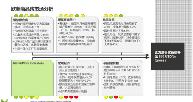對(duì)未來(lái)市場(chǎng)走向和趨勢(shì)的分析,我們可以從幾個(gè)維度入手。第一部分是供應(yīng)商的情況,芬林芬寶也是其中之一,但是有些特性是整個(gè)行業(yè)性的。目前,疫情對(duì)物流造成很大影響,包括運(yùn)輸時(shí)間不確定性、運(yùn)費(fèi)上漲,明年集裝箱和海運(yùn)的價(jià)格有較大的成本壓力,等等。紙漿供應(yīng)商由于商品漿價(jià)格在相對(duì)較長(zhǎng)時(shí)間內(nèi)維持低位,低利潤(rùn)率的壓力對(duì)企業(yè)來(lái)說(shuō)越來(lái)越明顯。 另外從供應(yīng)角度,包括北美和我們自己在三四季度的年度維修過(guò)程中縮減了一些產(chǎn)量,會(huì)造成臨時(shí)的供應(yīng)緊張。終端需求方面,變化比較大的在印刷書(shū)寫(xiě)紙,生活用紙和包裝用紙今年無(wú)論是在哪個(gè)市場(chǎng)狀況還是不錯(cuò)的,對(duì)紙漿的需求造成正向的促進(jìn)作用。供需關(guān)系主要看庫(kù)存,今年上半年的用量減少導(dǎo)致全球商品漿庫(kù)存增加,在今年三四季度庫(kù)存得到明顯釋放,需求量增加,供應(yīng)略減,成品漿庫(kù)存在9月底已經(jīng)有了明顯減少。 眾所周知,宏觀經(jīng)濟(jì)方面除了中國(guó)經(jīng)濟(jì)一枝獨(dú)秀,歐美經(jīng)濟(jì)開(kāi)始復(fù)蘇但還不樂(lè)觀,前景有不確定性。匯率對(duì)我們大宗商品貿(mào)易,尤其是紙漿還是有非常大的影響。各個(gè)方面的因素對(duì)商品漿價(jià)格都會(huì)有影響。歐洲市場(chǎng),紙漿庫(kù)存已降至合理區(qū)間。 漂針漿的價(jià)格 9月后 漂針漿價(jià)格方面,我們看到今年9月份后,全球加權(quán)平均價(jià)格走勢(shì)開(kāi)始回升。中國(guó)在這一輪商品漿價(jià)格走勢(shì)中起到關(guān)鍵性的引領(lǐng)作用,我們市場(chǎng)需求占到全球比重也顯示了市場(chǎng)領(lǐng)導(dǎo)者的地位。中國(guó)經(jīng)濟(jì)恢復(fù)越來(lái)越堅(jiān)實(shí),10月份工業(yè)增加值年度增加接近7%,尤其值得欣喜的是消費(fèi)延續(xù)了9月份的良好增長(zhǎng)態(tài)勢(shì),社會(huì)零售總額的年度增長(zhǎng)達(dá)到4.3%。經(jīng)濟(jì)復(fù)蘇前幾個(gè)月靠投資,夏天出口開(kāi)始回暖,到9、10月份國(guó)內(nèi)的需求恢復(fù)對(duì)經(jīng)濟(jì)增長(zhǎng)起到了決定性的拉動(dòng)作用。從需求角度講,接下來(lái)的商品漿市場(chǎng)需求會(huì)延續(xù)三季度良好態(tài)勢(shì),8-10月份紙張紙板生產(chǎn)量已遠(yuǎn)超去年同期。 針葉漿和闊葉漿在中國(guó)市場(chǎng)的差價(jià)情況跟歐洲差不多,雖然幅度和時(shí)間有所區(qū)別。但是市場(chǎng)面臨的挑戰(zhàn),即兩種漿的價(jià)差還在逐漸擴(kuò)大,這對(duì)行業(yè)來(lái)講是比較新的狀態(tài)。如何適應(yīng)這種狀態(tài),以及高位價(jià)差還將持續(xù)多久,都是我們關(guān)注的問(wèn)題。 紙漿的需求和供應(yīng)的發(fā)展趨勢(shì)