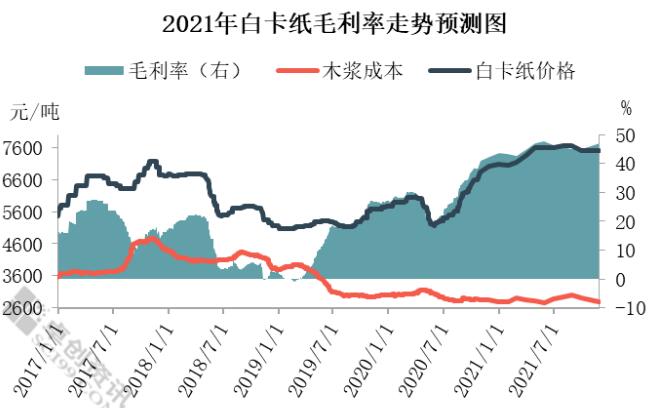 圖2 2021年白卡紙毛利率走勢預測圖 如圖所示,2017-2018年白卡紙價格呈現震蕩上漲的態勢, 2018年二季度開始下降,2019年一季度個別月份紙廠漿價小幅上行,而紙價下行,紙廠虧損。2019年下半年開始,漿價連續下行,白卡紙市場格局良好,紙價開啟上行通道,企業利潤有所增加。 2020年下半年開始白卡紙迎來行業景氣周期,另外產能集中度進一步提升,紙廠話語權加重,紙價連續拉漲,紙廠利潤大幅增加。 卓創預計2021年白卡紙價格持續上行,而2021年全球經濟回暖背景下針葉漿未來三年沒有新產能投放,價格處于上行通道,但受闊葉漿影響預計不會有很大漲幅;闊葉漿目前供過于求,明年有部分新產能,價格大漲可能非常小。 卓創認為白卡紙規模紙廠多屬于漿紙一體化,消耗量占比最多的化機漿以紙廠自產為主,預計2021年三季度之前尚無新增產能,同時受漿價對紙價影響偏弱影響,紙廠利潤繼續增加。 觀點: 從原料方面來說,卓創認為白板紙與原料相關性增加,但不是唯一,除了受供應端收緊影響,廢紙偏強震蕩以及原料替代品帶來的成本端增加,另外還將受白卡紙規模紙廠連續推漲帶動帶來的提漲刺激; 白卡紙或將與原料一致性再次減弱,主因市場供應僅在3季度以后有所增加,而需求受經濟恢復、出口增加、政策推動較強,此外產能集中度較高的行業格局同樣成為紙價提漲的利好推動。