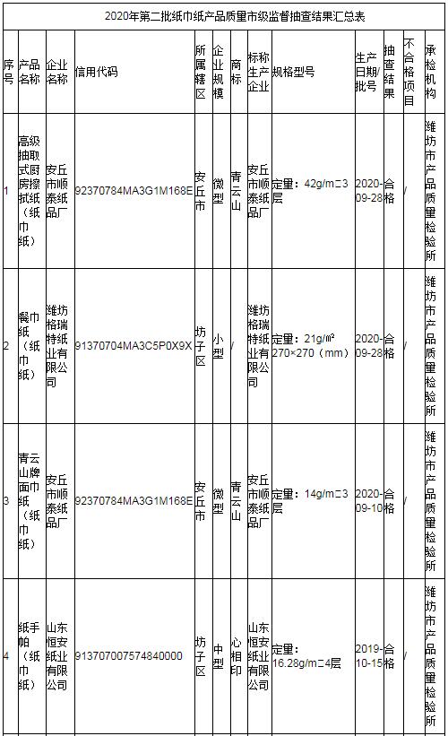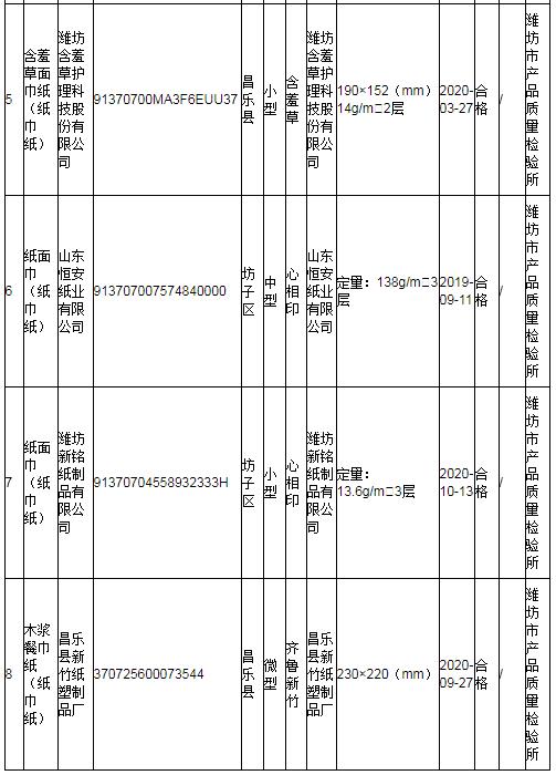 據山東省濰坊市市場監督管理局網站消息,2020年9月至11月,該局組織開展了第二批產品質量市級監督抽查。其中,抽查了全市6家企業的8批次紙巾紙產品,全部合格。