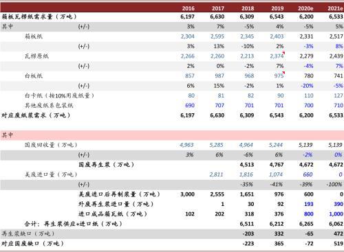 資料來源:紙業聯訊,卓創資訊,《富陽區造紙制造業改造提升實施方案(2017-2020)》,中金公司研究部 2021年白卡價格中樞有望繼續顯著抬升。2021年隨著需求恢復,疊加新增供給較少,我們預期明年白卡價格中樞有望維持在當前時點的高位附近,且有超預期可能性,龍頭有望持續享受超額利潤,帶動可觀業績彈性,疊加2021年新增產能釋放+存量產能利用率提升,我們看好2021年龍頭量價齊升,享受盈利彈性。中期來看,我們認為格局優秀,需求受益于限塑令+限廢令,仍有可觀增長空間的白卡紙是造紙行業最優秀的賽道之一,持續看好龍頭成長空間。 箱板瓦楞紙行業:供需改善+成本抬升,龍頭彈性有望超預期 2021年實際落地產能有限,行業供需面有望改善。據卓創統計,2016~2017年行業利潤的大幅擴張刺激了大批新增項目建設,考慮到普遍在2年左右的建設周期,陸續投產高峰實際在2018~2020年出現,對行業供需面形成了持續影響。市場擔憂2021年新增產能投放壓力較大,但據卓創統計,2021年計劃投放的產能或僅在400萬噸左右,其中相當部分產能本計劃2020年投放,但實際延期至2021年;已經宣布擬/在建的項目中,部分項目最終或因資金缺乏等原因擱淺,實際釋放的有效新增產能或遠小于市場此前預期。我們預期,隨著疫情對海外消費影響消退,2021年箱瓦紙需求有望整體向好,行業供需面有望改善。 2021年國廢缺口料將走闊,成本支撐明顯強化。展望2021年,專家估計全面禁止進口外廢將帶來600-650萬噸缺口,作為替代品的再生漿及進口箱瓦紙或在今年基礎上各再增加200萬噸左右,即使完全不考慮2021年需求改善,仍無法完全彌補國廢缺口。我們認為,如2021年下游需求改善,一方面國廢缺口有望進一步擴大,另一方面外需的改善有望壓制進口紙供應量,據我們測算,實際的國廢缺口很可能超過500萬噸,有望推動國廢價格顯著走高,使箱瓦紙成本支撐強化。在行業供需面改善背景下,我們認為廢紙漲價有望帶動明年箱瓦紙價向上、盈利改善。 2021年及中期小企業生存空間或再被壓縮,行業整合加速。我們通過復盤觀察到,2017年禁廢令后,小廠逐步被排斥出箱板紙市場,而被擠壓在格局分散、受進口紙沖擊嚴重的瓦楞紙市場,2H18行業整體下行以來,小廠盈利受到持續擠壓,生存維艱。我們認為,隨著2021年及中期國廢缺口走闊、進口紙沖擊持續(壓制小廠提價空間),小廠可能進一步出現資金緊張、原料緊缺、客戶流失等情況,或有部分小廠逐步推出或主動尋求被收購,行業集中度有望迎來加速提升。 圖表: 廢紙供需平衡表