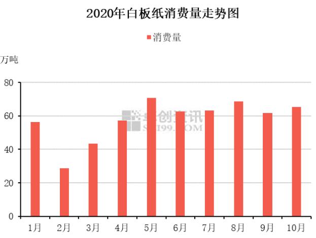 2019年春節(jié)前后白板紙?jiān)露认M(fèi)量變化較大,因春節(jié)前需求增加及春節(jié)后補(bǔ)倉,消費(fèi)明顯增加。詳細(xì)來看2020年白板紙消費(fèi)情況:2-3月消費(fèi)大幅下降,其中最低點(diǎn)在2月,消費(fèi)量?jī)H為28.64萬噸,較去年同期減少27.74萬噸,環(huán)比1月減少49.04%,主因國(guó)內(nèi)衛(wèi)生事件影響,紙廠復(fù)工延期,下游參市積極性不高。4月開始隨著下游需求陸續(xù)恢復(fù),市場(chǎng)交投增加,白板紙消費(fèi)逐步提高,但受浙江地區(qū)年初產(chǎn)能騰退影響,市場(chǎng)供應(yīng)不足,月度消費(fèi)仍較去年同期低3.72萬噸。6月開始白卡紙連續(xù)拉漲,白板紙、白卡紙價(jià)差逐步拉開,同時(shí)9月開始,陸續(xù)有前期產(chǎn)能轉(zhuǎn)移至山東、河南等地,預(yù)計(jì)到12月份,元旦、春節(jié)備貨影響下,白板紙消費(fèi)達(dá)到最高點(diǎn)。