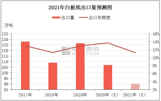 近年來國(guó)內(nèi)白板紙出口依賴度維持在8%-14%,2020年受全球性公共衛(wèi)生事件影響,國(guó)內(nèi)產(chǎn)能騰退影響,白板紙出口量繼續(xù)減少,出口依賴度下降明顯。國(guó)內(nèi)白板紙出口依賴度不大,且因國(guó)內(nèi)紙價(jià)良好預(yù)期和2021年上半年供應(yīng)收緊,卓創(chuàng)預(yù)計(jì)2021年國(guó)內(nèi)白板紙出口繼續(xù)減少,且對(duì)國(guó)內(nèi)紙價(jià)影響有限。