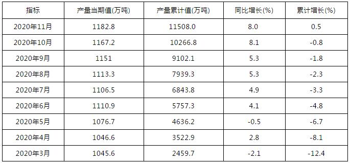據(jù)國家統(tǒng)計局最新消息,2020年11月,全國機(jī)制紙及紙板產(chǎn)量1182.8萬噸,同比增長8.0%。2020年1至11月,全國機(jī)制紙及紙板總產(chǎn)量10508.0萬噸,同比增長0.5%,2020年以來首次實現(xiàn)累計產(chǎn)量同比增長。