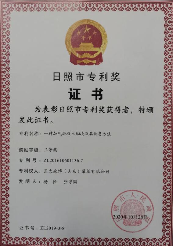近日,日照市政府發布《關于2019年度日照市專利獎勵的決定》(日政字[2020]65號),公司完成的“一種加氣混凝土砌塊及其制備方法”發明專利,榮獲日照市專利獎三等獎。