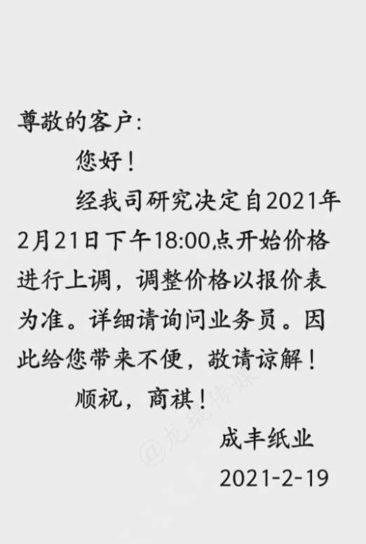 2月18日,正值業內各大企業開工之際,新的一批原紙、紙板漲價函就已襲來。2月19日,漲價范圍逐步擴大,各地中小型紙企紛紛跟漲,紙板、紙箱價格水漲船高。顯然,2021年春節后的第一輪漲價潮,已初具規模。 各地中小跟漲50-200元/噸 在國內三大包裝紙龍頭中,玖龍紙業計劃2月22日上調紙價,山鷹紙業已于2月18日宣布漲價,理文造紙則在2月19日開始調價:江西理文H紙價格上調200元/噸,B/Q紙價格上調100元/噸;江蘇理文箱板紙價格上調100元/噸。 其他大型紙廠也傳出漲價消息,如福建聯盛紙業,牛卡紙漲價100-200元/噸,瓦楞紙漲價100元/噸;浙江景興紙業,瓦楞紙、牛卡紙上調100元/噸;湖北金鳳凰紙業,瓦楞紙上漲100元/噸;山東世紀陽光紙業,白面牛卡紙漲價300元/噸,瓦楞紙上漲100元/噸…… 同時,各地的中小型紙廠也紛紛發布漲價函,東莞金田紙業、中冶銀河紙業、玉田縣順發實業、棗莊華潤紙業等紙企跟漲50-200元/噸,涉及瓦楞紙、牛卡紙、灰紙板等紙種。據筆者統計,目前這輪漲價函已涵蓋浙江、廣東、福建、湖北、河北、山東、江西、江蘇等省份。 東莞市金田紙業有限公司 從2021年2月20日起,所有灰紙板產品在原價格基礎上統一上漲200元/噸,金娃牌環保牛卡紙、金泊牌再生牛卡紙在原價格基礎上上漲100元/噸。  中冶銀河紙業有限公司 從2月19日起,高強瓦楞原紙產品價格在原價格基礎上統一上漲50元/噸。  玉田縣順發實業有限公司 從2021年2月19日起,所有克重及品項的成品紙上漲100元/噸。  棗莊華潤紙業有限公司 從2021年2月20日起,一次成型灰紙板和卷筒灰板紙在原有價格基礎上統一漲價200元/噸。  紙板漲價范圍逐步擴大 2月18日,在原紙價格持續拉升的狀態下,福建福州、浙江寧波、浙江臺州等城市的紙板廠首先打響了年后的第一輪上漲。2月19日,紙板漲價范圍逐步擴大,江西上饒、廣東揭陽、浙江金華等城市也迎來了新的紙板漲價函。 上饒市卓然實業有限公司 即日起,三層紙板上調0.05元/平方,四、五層上調0.1元/平方米,七層上漲0.15元/平方米。  磐安市宜家工貿有限公司 自2月19日17點開始,三層紙板上漲0.1元/平方,四層、五層上漲0.2元/平方,七層上漲0.3元/平方。加硬一層110克加0.2元/平方,加硬一層130克加0.3元/平方,加硬一層160克加0.6元/平方。  永康市星光包裝 從2月19日17點開始,三層紙板上調0.1元/平方,五層上漲0.2元/平方;110克加硬一層加0.2元/平方,兩層加0.4元/平方;140克加硬一層加0.3元/平方,兩層加0.6元/平方;160克加硬一層加0.55元/平方,兩層加1.1元/平方;紙板長度少于50厘米,另加0.2元/平方;紙板寬度少于20厘米,另加0.2元/平方。  成豐紙業 從2021年2月21日18點開始,價格上調。  盡管年前大家對年后的紙價形勢已有心理準備,但原紙漲價潮真正到來的這一刻,還是會有所驚訝。尤其是對處于紙品包裝產業鏈最下游的紙箱廠而言,成本不斷上漲,有時根本來不及與客戶協商調價,最終只能由自身承擔一部分風險。 此外,還有一個現象需要注意,當前除了原紙之外,各種大宗原料基本上都保持上漲勢頭,這是否意味著,紙價上漲并非是單純的行業現象,而是宏觀環境下的小小縮影?