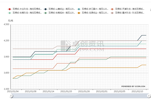 2月份瓦楞及箱板紙市場呈“月初拉漲—中旬假期有價無市—假期后繼續炒漲”的運行態勢,目前企業報價略顯混亂,高低價差有所拉大。節后歸來,浙江、湖北、河南、廣東等地區價格調漲50-300元/噸,從下圖企業報價來看,紙廠報價均有一定程度上調,市場對玖龍集團2月22日調價也較為關注。