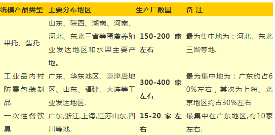 紙漿模塑工業在中國僅有十幾年的歷史,發展卻非常迅速,原因有二,其一,紙模制品本身在環保、價格、性能等方面比替代品有顯著優勢。其二,政府的大力扶持和世界大環境的影響。 目前,我國的紙漿模塑工業無論是生產工藝、產品性能,機械設備,還是生產規模都處于世界前列。 一、分布情況