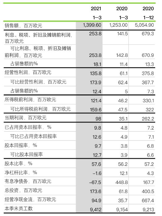 2021年1-3月(與2020年1-3月相比) . 銷售額為14億歐元(去年同期:12.53億歐元)。 . 經(jīng)營性利潤為1.36億歐元(去年同期:6100萬歐元)。可比經(jīng)營性利潤為1.74億歐元(去年同期:6200萬歐元)。 . 稅前利潤為1.21億歐元(去年同期:4600萬歐元)。可比稅前利潤為1.60億歐元(去年同期:4800萬歐元)。 . 可比已占用資本回報(bào)率為12.6%(去年同期:4.9%)。 . 經(jīng)營性凈現(xiàn)金流為9500萬歐元(去年同期:3600萬歐元)。 2021年第一季度主要事件 . 與上一季度相比,長纖漿和短纖漿以美元計(jì)算的市場均價(jià)都出現(xiàn)增長。 . 紙板交付量達(dá)到歷史新高,需求保持旺盛。 . 芬林芬寶做出建設(shè)芬蘭凱米(Kemi)新生物制品工廠的投資決定。投資額約為16億歐元。  凱米(Kemi)生物制品工廠 . 芬林紙板啟動(dòng)瑞典胡蘇姆(Husum)工廠擴(kuò)建前期工程,擴(kuò)建后工廠的折疊紙板年產(chǎn)能將增加約20萬噸。  胡蘇姆(Husum)工廠 . 芬林紙板將胡蘇姆木漿廠30%的股份出售給NorraSkog。 . 芬林集團(tuán)啟動(dòng)一項(xiàng)耗資1.5億歐元的項(xiàng)目,以更新其企業(yè)資源計(jì)劃(ERP)系統(tǒng)。 . 芬林之春(MetsäSpring)推出紡織纖維品牌Kuura。  芬林紡織纖維品牌Kuura 新冠肺炎疫情大流行 在阻止新冠疫情大流行方面,芬林集團(tuán)在運(yùn)營中抓住三個(gè)重點(diǎn):人員安全、履行社會(huì)責(zé)任全力參與抗擊疫情、確保業(yè)務(wù)連續(xù)性。芬林集團(tuán)遵循并遵守政府機(jī)構(gòu)發(fā)布的新冠疫情指南。避免身體接觸是最重要的預(yù)防措施。在新冠疫情大流行期間,芬林集團(tuán)的資源供應(yīng)保持正常。除了一些例外情況,生產(chǎn)和交貨均保持正常。 本季度以后發(fā)生的事件 SariPajari-Sederholm被任命為芬林集團(tuán)戰(zhàn)略執(zhí)行副總裁,此項(xiàng)任命將于2021年5月1日生效。她于2007年加入芬林集團(tuán),曾任芬林集團(tuán)首席信息官,并任職于芬林紙板的多個(gè)管理崗位。在此項(xiàng)新任命前,Pajari-Sederholm擔(dān)任芬林紙板銷售及市場高級(jí)副總裁。在新職位上,Pajari-Sederholm將負(fù)責(zé)芬林集團(tuán)的戰(zhàn)略規(guī)劃、籌備和執(zhí)行支持、以及各項(xiàng)業(yè)務(wù)發(fā)展計(jì)劃。