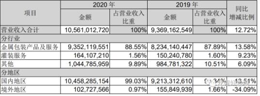 繼合興包裝、裕同科技之后,包裝印刷業(yè)第三家百億收入企業(yè)誕生!4月19日,奧瑞金科技股份有限公司公布2020年年度報(bào)告:實(shí)現(xiàn)營(yíng)收105.61億元,同比增長(zhǎng)12.72%;實(shí)現(xiàn)歸母凈利潤(rùn)7.07億元,同比增長(zhǎng)3.54%。  奧瑞金年收入突破百億元 與主營(yíng)紙包裝的合興包裝、裕同科技不同,奧瑞金是一家金屬包裝企業(yè),主要生產(chǎn)二片罐、三片罐等產(chǎn)品,服務(wù)于紅牛、東鵬特飲、百威啤酒、青島啤酒、燕京啤酒、雪花啤酒、加多寶、可口可樂(lè)、百事可樂(lè)、旺旺、天地壹號(hào)等快消品品牌。 財(cái)報(bào)顯示,在奧瑞金2020年的105.61億元收入中,金屬包裝產(chǎn)品及服務(wù)業(yè)務(wù)收入為93.52億元,同比增長(zhǎng)13.58%,占總營(yíng)收的88.55%;灌裝服務(wù)業(yè)務(wù)收入為1.64億元,同比增長(zhǎng)9.23%;其他收入為10.45億元,同比增長(zhǎng)6.09%。