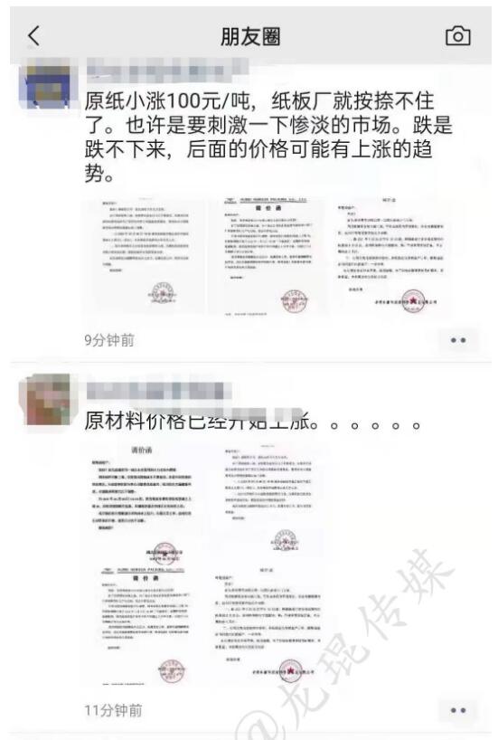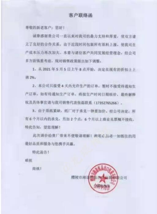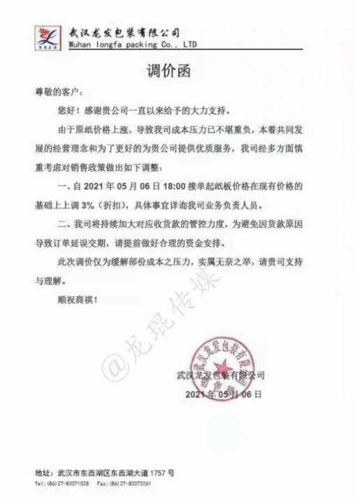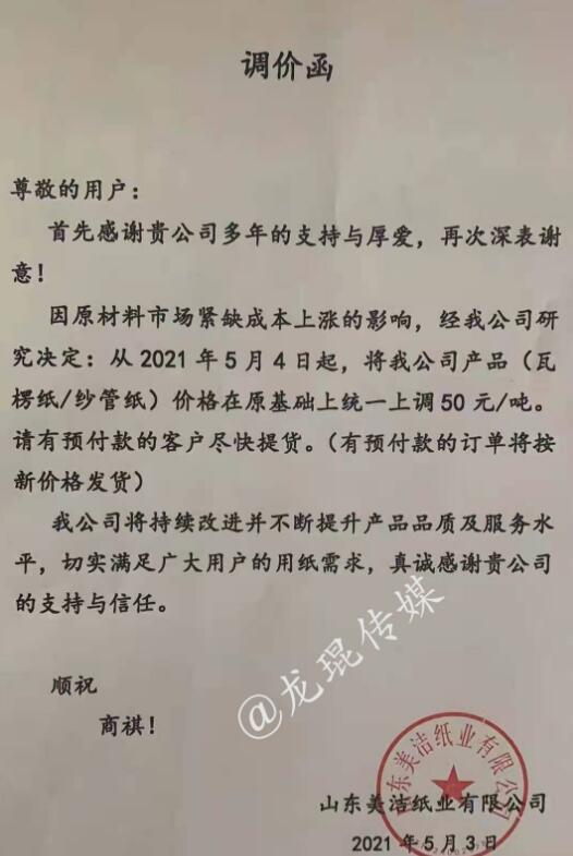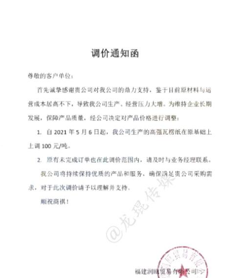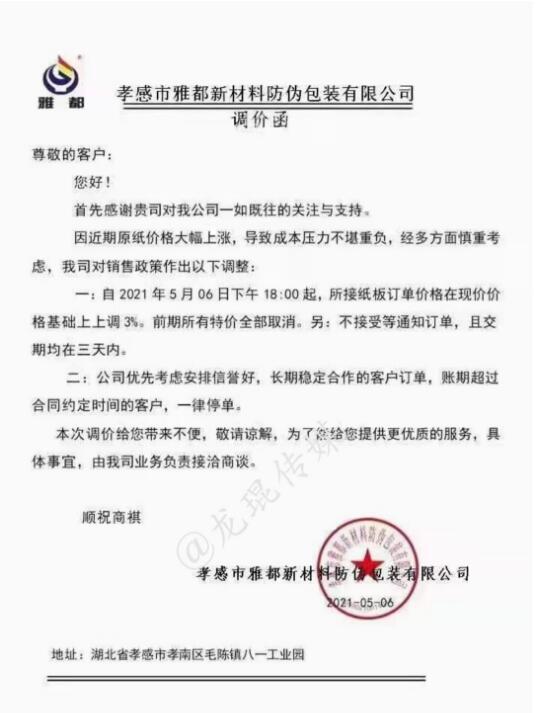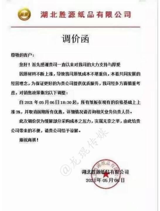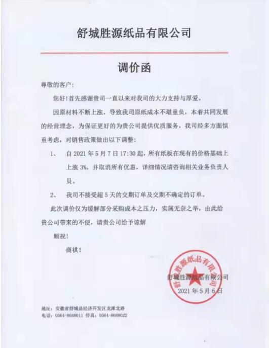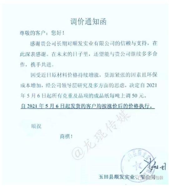5月6日,五一長假正式結(jié)束,國內(nèi)紙業(yè)市場經(jīng)過平穩(wěn)下滑后再度冒出上漲勢頭。當(dāng)天,玖龍紙業(yè)多個基地逐步取消前期優(yōu)惠,恢復(fù)原價,引起市場新一輪動蕩。華東、華南、華北等地區(qū)大批紙廠陸續(xù)漲價,紙板廠迫于壓力緊跟上調(diào)。  紙廠普遍上調(diào)50-100元/噸 五一假期尚未結(jié)束之時,原紙市場就已出現(xiàn)漲價函。據(jù)了解,5月1日到5月5日,廣東、河北、山東等地多家紙廠宣布漲價,比如東莞市雙洲紙業(yè)上調(diào)高瓦價格50元/噸,沙河錦新紙業(yè)上調(diào)高瓦和紗管紙50元/噸,山東省美潔紙業(yè)瓦楞紙/紗管紙價格漲價50元/噸…… 山東省美潔紙業(yè)有限公司 從5月4日起,瓦楞紙/紗管紙價格在原基礎(chǔ)統(tǒng)一上調(diào)50元/噸。  5月6日,假期正式結(jié)束,玖龍紙業(yè)多個基地逐步取消前期優(yōu)惠。同時,全國各地宣布漲價的紙廠陸續(xù)增多,部分紙廠甚至要求原有未完成的已接訂單也在漲價范圍內(nèi)。從公開可見的漲價函中可以看到,紙廠普遍表示,原材料價格上調(diào)以及環(huán)保因素是漲價的主要原因。 福建潤甌貿(mào)易有限公司 從2021年5月6日起,公司生產(chǎn)的高強瓦楞紙在原基礎(chǔ)上漲100元/噸。  河南順捷環(huán)保科技有限公司 從2021年5月6日起,在目前銷售價格上上漲100元/噸,原有已接訂單未完成的也在漲價范圍內(nèi)。  玉田市順豐實業(yè)有限公司 從2021年5月6日起,所有克重及品項的成品紙每噸上調(diào)50元。  此外,據(jù)筆者了解,在大型紙廠方面,目前東莞理文、浙江山鷹均有部分紙種開始上調(diào)。在當(dāng)前的形勢下,包裝紙價經(jīng)過4月份的持續(xù)下滑已降至相對低位,幾家龍頭大廠又陸續(xù)停機檢修,5月份的紙價相較于4月份,整體上或維持小幅上漲的趨勢。 多地紙板價格上漲2%-5% 對于當(dāng)前的紙價走勢,不少業(yè)內(nèi)人士在假期之前便有預(yù)料。記得4月底江蘇某包裝廠老總向筆者透露,原紙價格經(jīng)過一段時間調(diào)整后已處于低位,紙廠庫存消耗較多,玖龍5月份一旦取消優(yōu)惠,紙價將會立刻上漲。時至今日,果不其然。 隨著原紙市場新一輪動蕩,下游紙板市場反應(yīng)迅速。5月3日,儀征市美優(yōu)紙業(yè)有限公司宣布,紙板及紙箱在原價格基礎(chǔ)上上調(diào)5%。5月5日-5月7日,安徽、湖北等地又有多家二級廠相繼上調(diào),漲幅為2%-5%。 儀征市美優(yōu)紙業(yè)有限公司 從2021年5月3日起,紙板及紙箱在原價格基礎(chǔ)上上調(diào)5%。  醴陵市湘諧紙品出口包裝有限公司 從5月5日上午8點開始,在現(xiàn)有折扣基礎(chǔ)上上漲2%。  湖北勝源紙品有限公司 從2021年5月6日18點半開始,所有紙板在現(xiàn)有價格基礎(chǔ)上上漲3%。  武漢龍發(fā)包裝有限公司 從2021年5月6日18點開始,紙板價格在現(xiàn)有價格基礎(chǔ)上上調(diào)3%(折扣)。  孝感市雅都新材料防偽包裝有限公司 從5月6日18點開始,所接紙板訂單在現(xiàn)價格基礎(chǔ)上上漲3%。  舒城勝源紙品有限公司 從5月7日17點半開始,所有紙板在現(xiàn)有的價格基礎(chǔ)上上漲3%,并取消所有優(yōu)惠。  從短期來看,伴隨著國廢價格持續(xù)回漲,原紙價格小幅上調(diào),紙板及紙箱價格將在近期以上調(diào)為主。同時,由于電商“6.18”活動將在下月舉行,電商需求上升,產(chǎn)業(yè)鏈各環(huán)節(jié)的產(chǎn)品價格與前幾月相比,存在一定的需求支撐。 從中長期來看,二季度距離旺季仍然較遠(yuǎn),終端消費需求難以大幅度上升,原紙、紙板以及紙箱價格必然會以階段性調(diào)整為主,無論是小幅度的上漲還是下跌,均屬正常。三季度過后,紙包裝行業(yè)的旺季逐步來臨,紙制產(chǎn)品價格迎來全面上調(diào)通道。