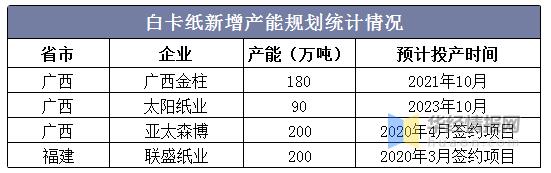 白卡紙(原生白板紙)原材料為木漿,白板紙(再生白板紙)原材料為廢紙。白卡較白板紙更光滑,價(jià)格更高,更多用作高檔包裝,但在一定程度上二者可相互替代。 白卡紙是一種較厚實(shí)堅(jiān)挺純優(yōu)質(zhì)木漿制成的白色卡紙,經(jīng)壓光或壓紋處理,主要用于包裝裝潢用的印刷承印物。 一、白板紙分類(lèi)情況  資料來(lái)源:華經(jīng)產(chǎn)業(yè)研究院整理 二、我國(guó)白卡紙行業(yè)發(fā)展現(xiàn)狀 2020年以來(lái)受疫情影響,紙品需求受到一定抑制和負(fù)面沖擊。2020年4月下旬開(kāi)始,行業(yè)木漿系紙品出現(xiàn)大幅下滑,但6月開(kāi)始,行業(yè)價(jià)格開(kāi)始逐步企穩(wěn)回升,伴隨需求回暖,白板紙去庫(kù)存速度較好至合理水平后,白板紙市場(chǎng)將會(huì)逐漸復(fù)蘇。 2012-2019年我國(guó)白板紙產(chǎn)能總體維持在1400萬(wàn)噸左右,但白板紙銷(xiāo)量從1390萬(wàn)噸減少至1277萬(wàn)噸。隨著我國(guó)限塑令的趨嚴(yán),白板紙作為替代產(chǎn)品,并在應(yīng)用場(chǎng)景多元化與消費(fèi)升級(jí)助力下,消費(fèi)量將繼續(xù)攀升。  資料來(lái)源:造紙工業(yè)協(xié)會(huì),華經(jīng)產(chǎn)業(yè)研究院整理 白卡紙2019年產(chǎn)量約為1047萬(wàn)噸,同比增長(zhǎng)14.5%,白卡紙開(kāi)工率經(jīng)歷從2016年低位開(kāi)始逐步回升,2019年開(kāi)工率同比提升7pct至88%。2016年白卡紙行業(yè)開(kāi)工率降至歷史低位,2017~2019產(chǎn)能增長(zhǎng)有限,同時(shí)出現(xiàn)白卡對(duì)白板的替代,開(kāi)工率逐步提升至高位。  資料來(lái)源:公開(kāi)資料整理 短期內(nèi)白卡紙新增產(chǎn)能較為有限,未來(lái)2-3年,白卡紙新規(guī)劃產(chǎn)能預(yù)計(jì)約670萬(wàn)噸;其中,廣西金桂預(yù)計(jì)2021年10月投產(chǎn)180萬(wàn)噸、太陽(yáng)紙業(yè)預(yù)計(jì)于2023年10月投產(chǎn)90萬(wàn)噸。目前,白卡紙新增產(chǎn)能披露計(jì)劃較少,疊加限塑令推進(jìn)、白板紙?zhí)娲卓堏厔?shì)下,預(yù)計(jì)白卡紙供給或?qū)⒉荒軡M(mǎn)足新增需求,缺口將帶動(dòng)白卡紙價(jià)格上漲。  資料來(lái)源:公司公告、華經(jīng)產(chǎn)業(yè)研究院整理 商超、快遞、外賣(mài)業(yè)尋求塑料替代品,環(huán)保白卡紙為首選。我國(guó)互聯(lián)網(wǎng)外賣(mài)訂單持續(xù)高增,商家對(duì)于環(huán)保餐盒的需求量顯著提升。根據(jù)《國(guó)家食品安全標(biāo)準(zhǔn)食品接觸用紙和紙板材料及制品》,食品級(jí)包裝用紙需以原木漿為原料,食品級(jí)環(huán)保白卡有望成為主要替代材料。2015-2019年我國(guó)互聯(lián)網(wǎng)餐飲外賣(mài)訂單量從17億單增長(zhǎng)到160億單,年復(fù)合增長(zhǎng)率為75.15%,加上限塑令推進(jìn)將助推塑料包裝向環(huán)保級(jí)食品卡轉(zhuǎn)移,白卡紙行業(yè)未來(lái)發(fā)展前景向好。  資料來(lái)源:公開(kāi)資料整理 藥品和高檔化妝品銷(xiāo)量回暖,包裝消費(fèi)升級(jí)提升白卡紙下游需求。白卡紙下游需求多樣化,多用于制作藥品、香煙乳制品、臺(tái)歷、名片等高檔包裝,以及食品包裝、餐飲服務(wù)類(lèi)等環(huán)保包裝。其中藥品、香煙和食物類(lèi)包裝需求最大,分別占28%,11%和11%。今年以來(lái),必選品增長(zhǎng)穩(wěn)健,可選消費(fèi)于二季度逐步復(fù)蘇,藥品和化妝品銷(xiāo)售額顯著回升,卷煙和乳制品銷(xiāo)量保持平穩(wěn)增長(zhǎng),互聯(lián)網(wǎng)外賣(mài)訂單量高增,隨著消費(fèi)升級(jí)和環(huán)保政策,白卡紙行業(yè)景氣度最旺。  資料來(lái)源:公開(kāi)資料整理 相關(guān)報(bào)告:華經(jīng)產(chǎn)業(yè)研究院發(fā)布的《2020-2025年中國(guó)白卡紙行業(yè)發(fā)展趨勢(shì)預(yù)測(cè)及投資戰(zhàn)略咨詢(xún)報(bào)告》  三、我國(guó)白卡紙行業(yè)競(jìng)爭(zhēng)格局 根據(jù)卓創(chuàng)資訊和紙業(yè)聯(lián)訊數(shù)據(jù),我國(guó)白卡紙現(xiàn)有產(chǎn)能1034萬(wàn)噸,其中金光紙業(yè)在浙江寧波和廣西欽州合計(jì)共有白卡紙產(chǎn)能350萬(wàn)噸/年,博匯紙業(yè)現(xiàn)有最大產(chǎn)能為215萬(wàn)噸/年,晨鳴紙業(yè)和萬(wàn)國(guó)太陽(yáng)的白卡紙產(chǎn)能分別為200萬(wàn)噸/年和140萬(wàn)噸/年。這四大白卡紙企業(yè)的市占率合計(jì)達(dá)到87.52%。 2020年,在完成對(duì)博匯紙業(yè)的收購(gòu)后,金光紙業(yè)的白卡紙國(guó)內(nèi)市占率將達(dá)到54.64%(加上金光紙業(yè)廣西180萬(wàn)噸白卡紙新建產(chǎn)能后,市占率將達(dá)到61.36%),白卡紙行業(yè)將形成金光紙業(yè)一家獨(dú)大格局,未來(lái)集中度有望進(jìn)一步提升。  資料來(lái)源:公開(kāi)資料整理 四、我國(guó)白卡紙行業(yè)未來(lái)發(fā)展趨勢(shì) 在中小型白卡紙企業(yè)陸續(xù)退出、行業(yè)集中度不斷提高的情況下,龍頭企業(yè)之間的競(jìng)爭(zhēng)將日益激烈。我國(guó)白板紙行業(yè)已經(jīng)逐步進(jìn)入成熟期,僅僅依靠產(chǎn)量來(lái)提高市占率作用較小,企業(yè)需更加重視新品研發(fā)能力,尋找新的細(xì)分市場(chǎng),向需求潛力更大的細(xì)分產(chǎn)品領(lǐng)域發(fā)展。另外,由于消費(fèi)升級(jí),市場(chǎng)對(duì)白卡紙的多元化要求不斷提高,生產(chǎn)企業(yè)也可以向定制化、個(gè)性化方向發(fā)展。